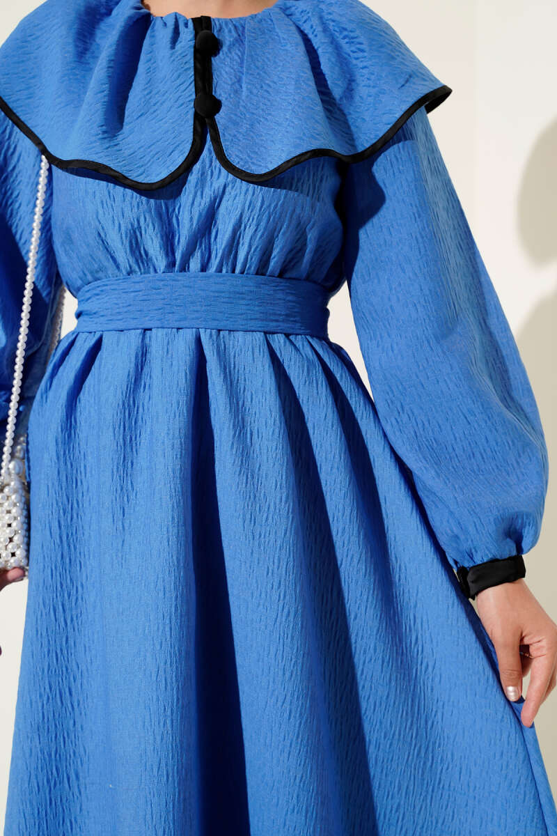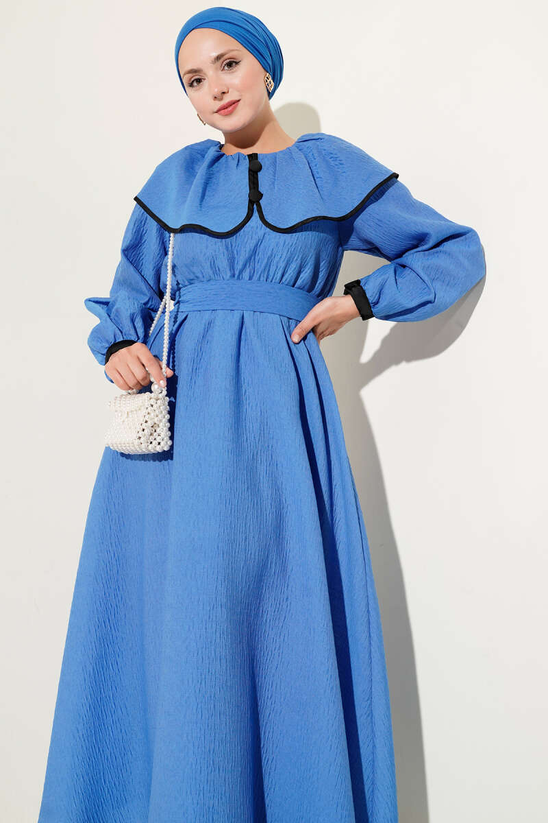 Bebe Yaka Bel Lastikli Elbise Saks