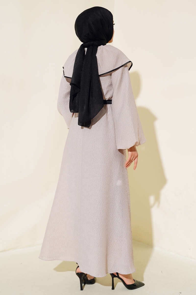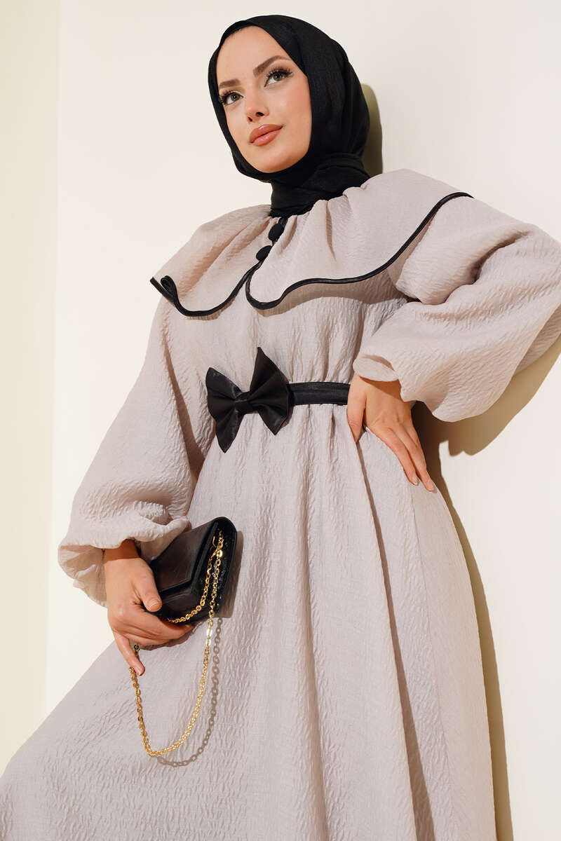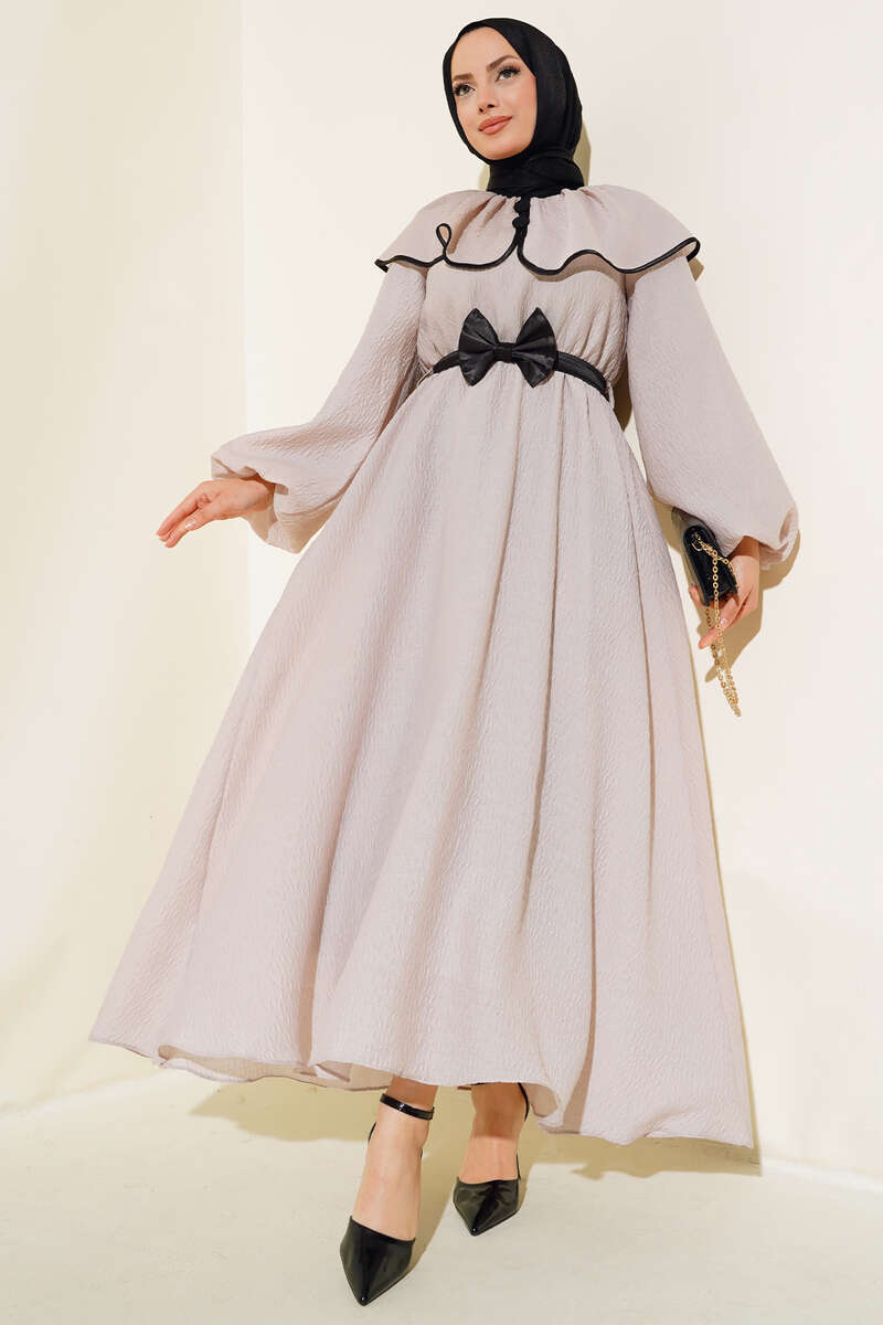 Yeni sezon elbisemiz sizlerle beraber. Elbisemiz beb yakadır. Sırtı fermuarlıdır. Beli ve kol bilekleri lastiklidir. Elbisemiz balon koldur. İki adet kemer köprüsü vardır. Bir adet çıtçıtlı kurdale kuşağı vardır. Astarlıdır.