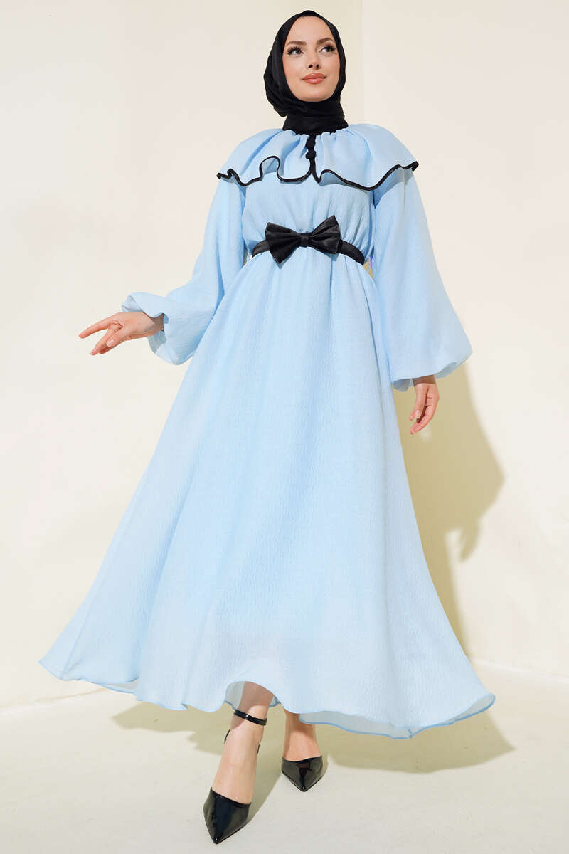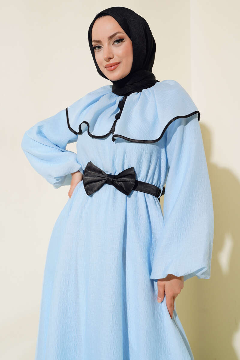 Bebe Yaka Fiyonklu Elbise Mavi
