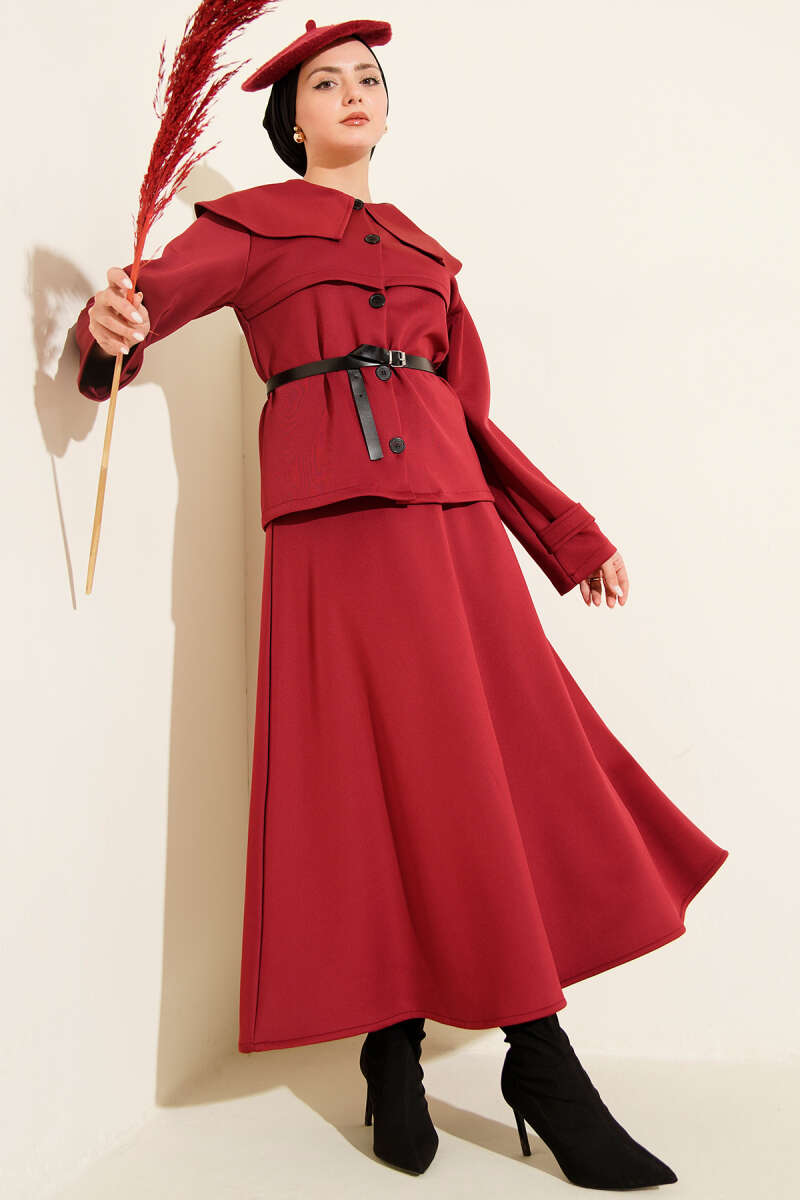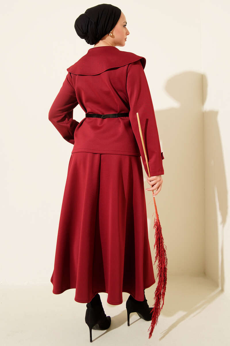 Düğmeli Sahte Cepli Scuba Etekli İkili Takım Bordo