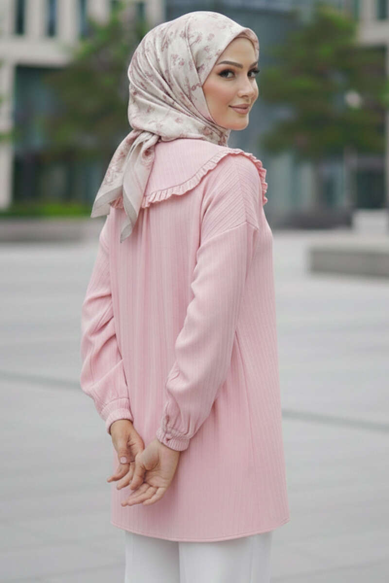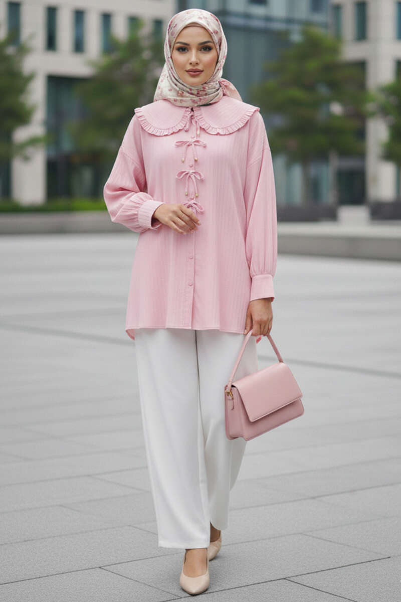 Brit Düğmeli Yaka Bağcıklı Tunik Pembe
