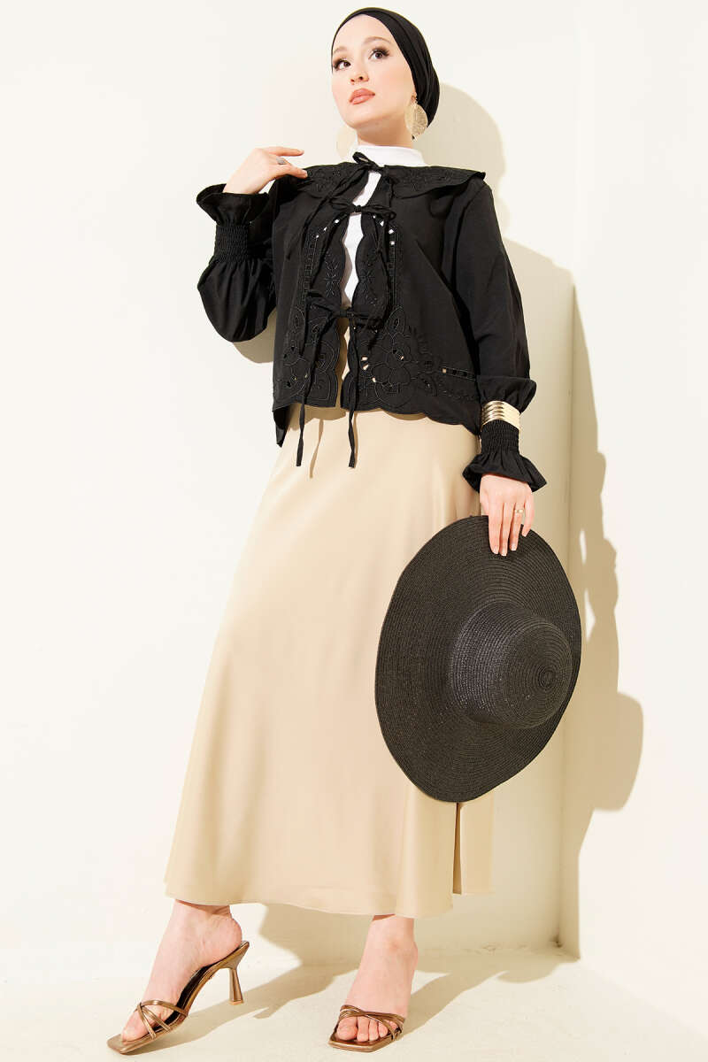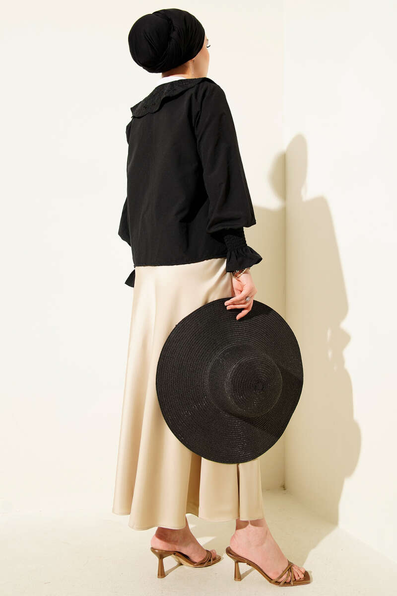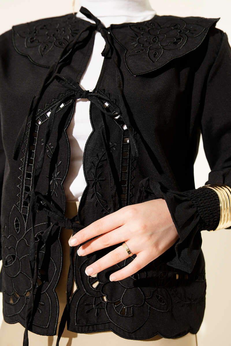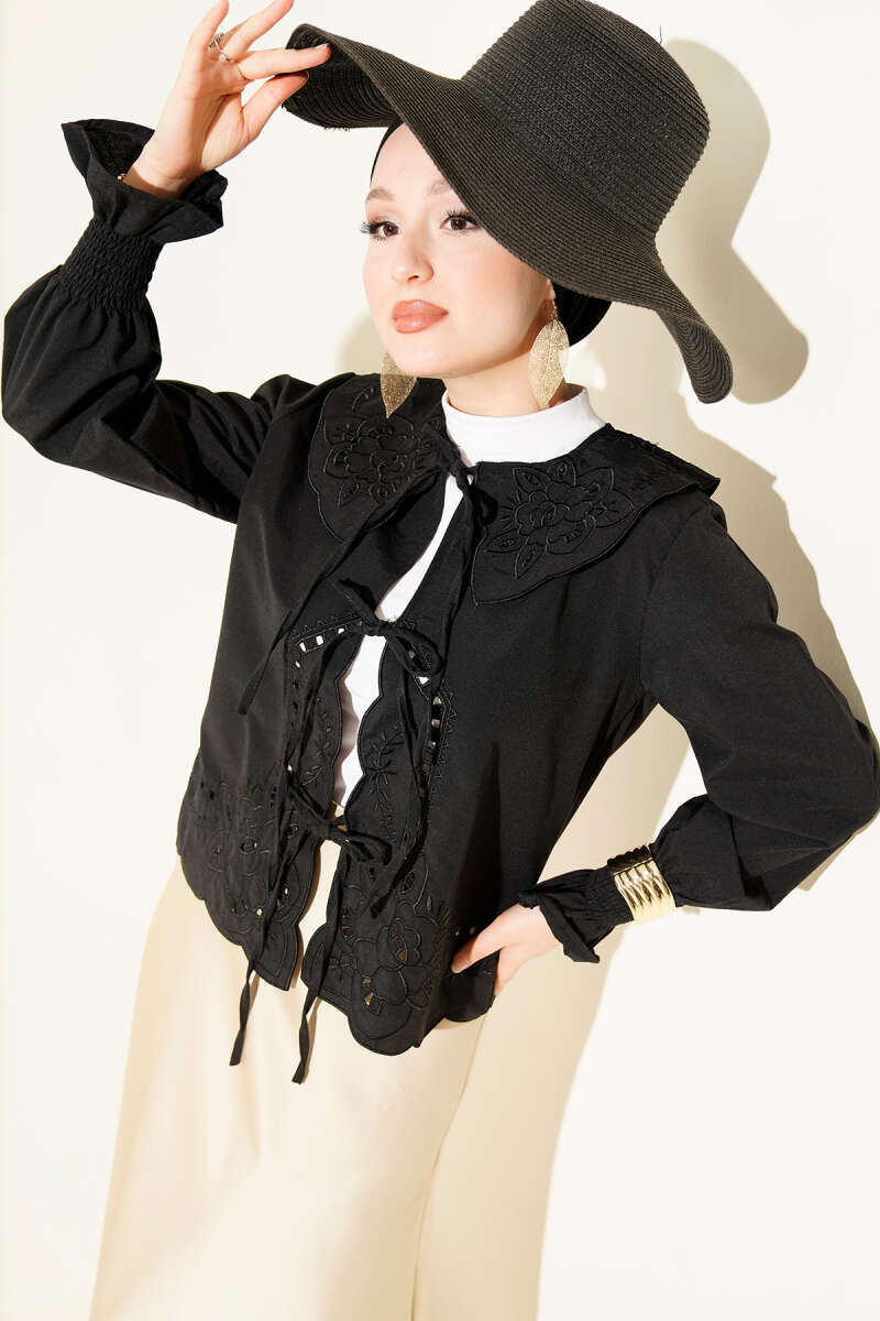 Bebe Yaka Nakışlı Bağlamalı Bluz Siyah