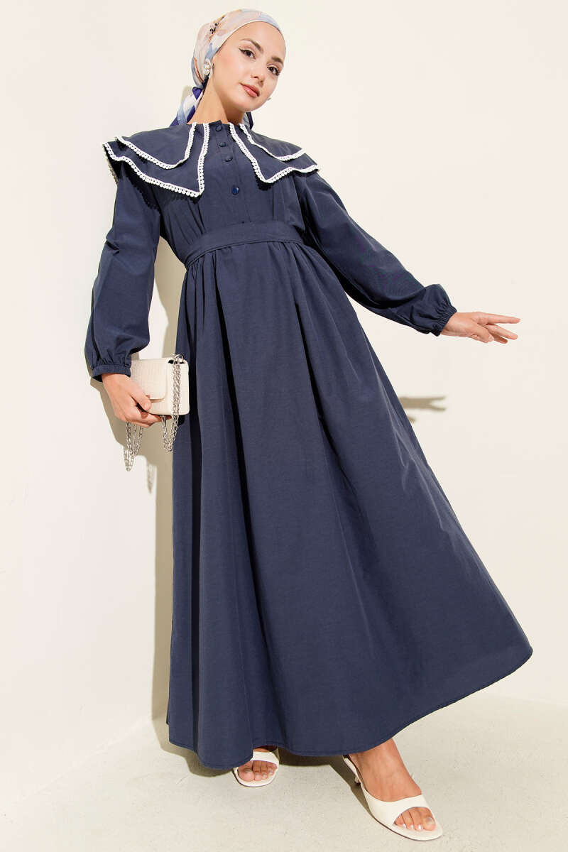 Pelerin Detaylı Pileli Triko Elbise Lacivert