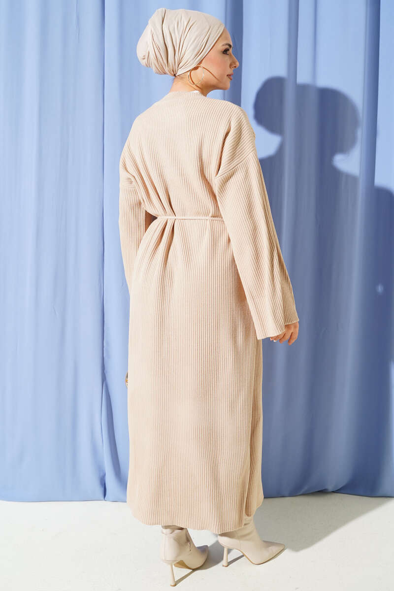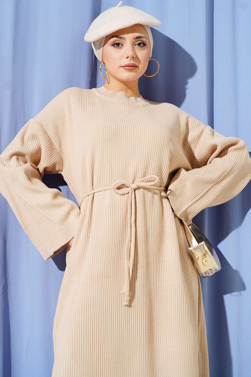 Bel Bağcıklı Bisiklet Yaka Triko Elbise Bej