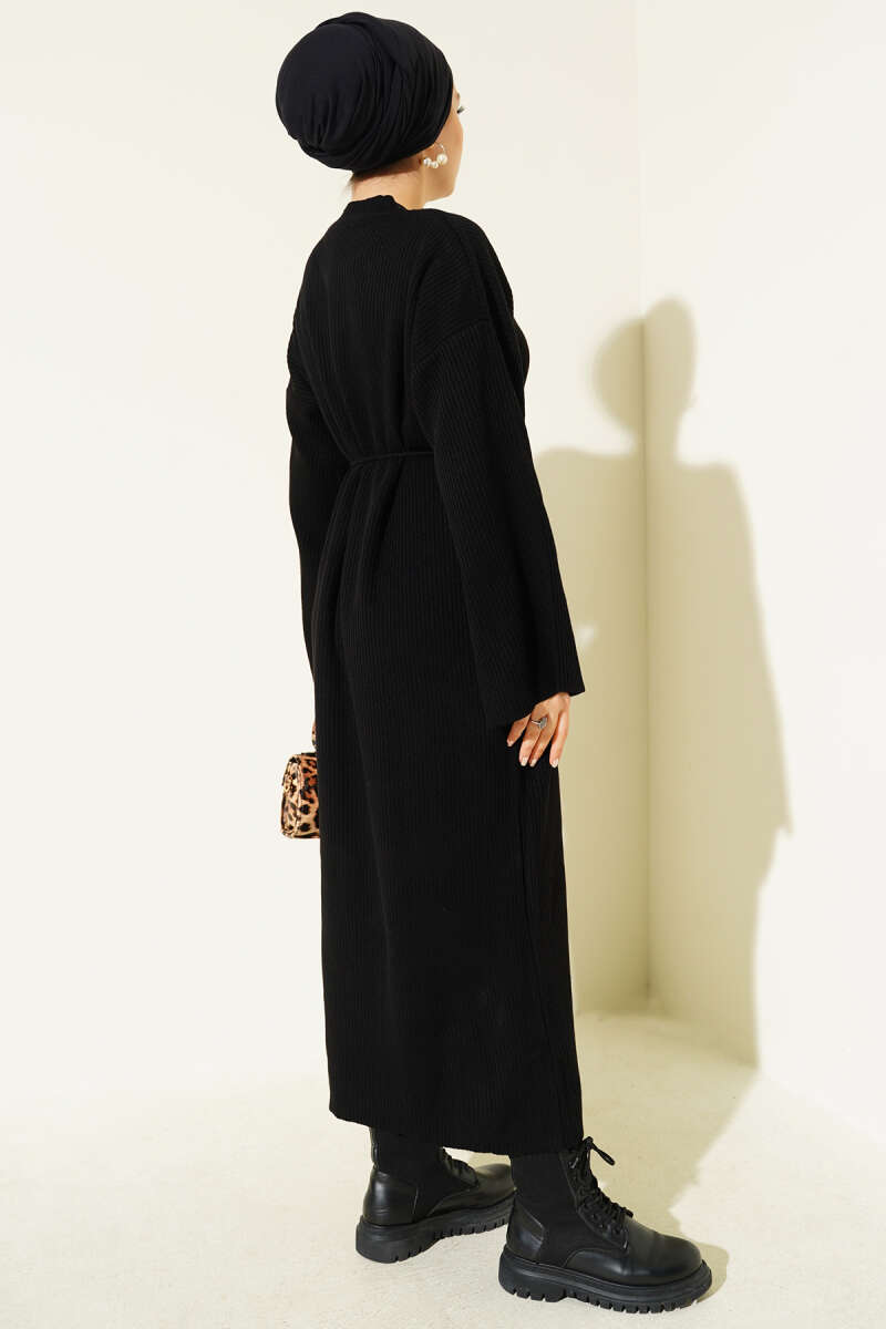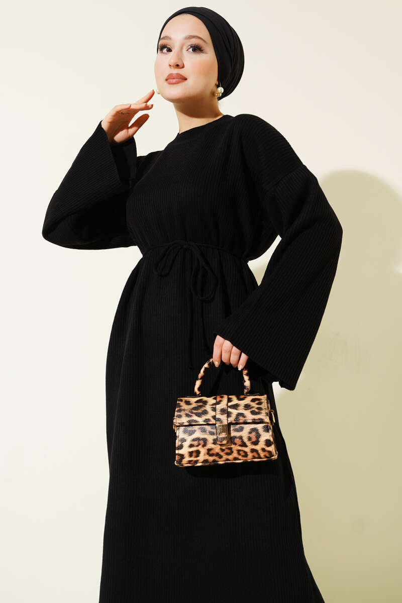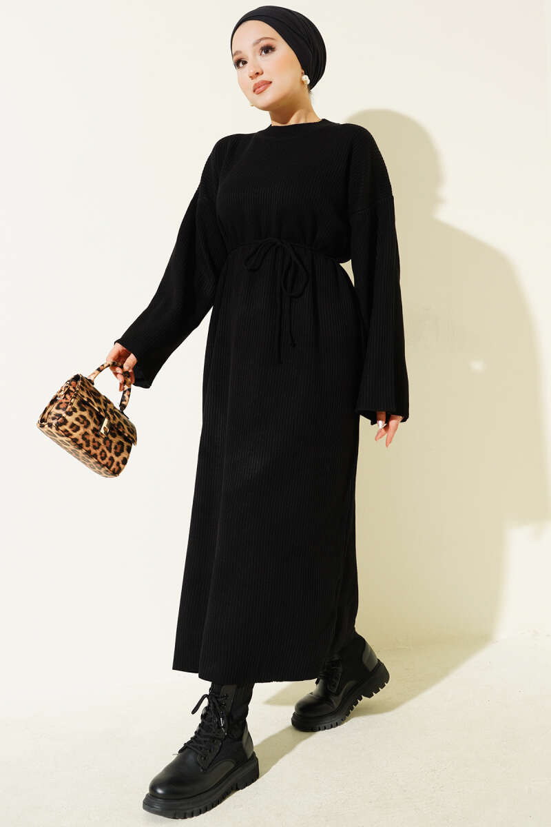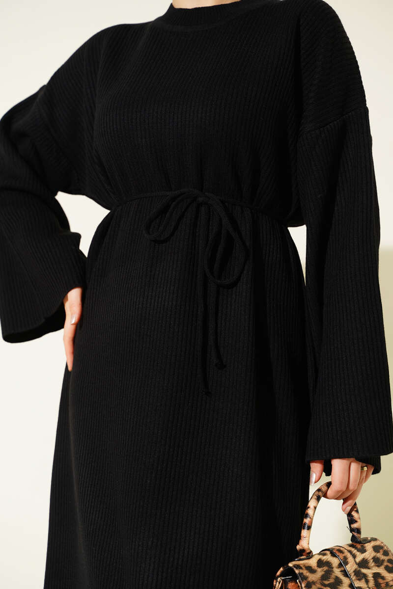 Bel Bağcıklı Bisiklet Yaka Triko Elbise Siyah
