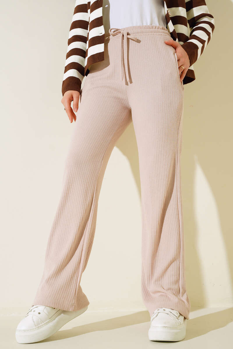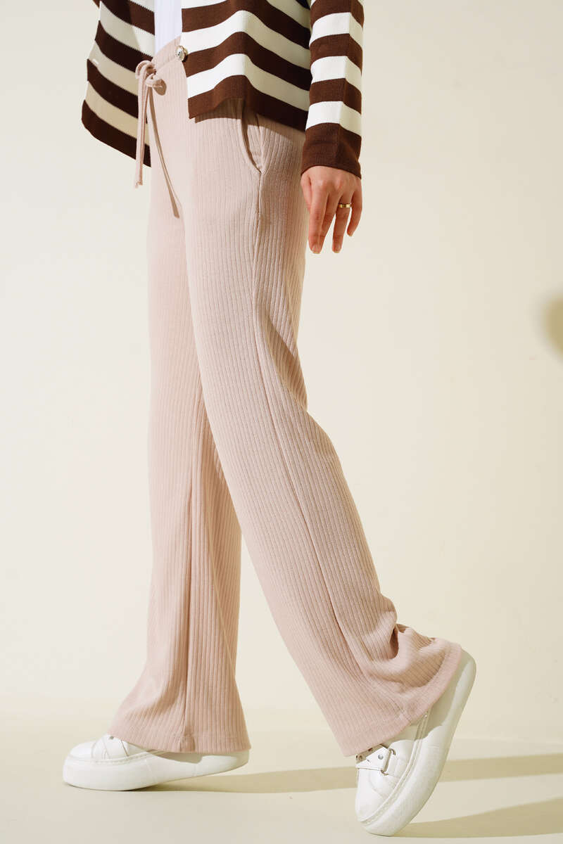 Bel Bağcıklı Bol Paça Pantolon Bej