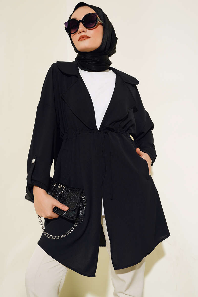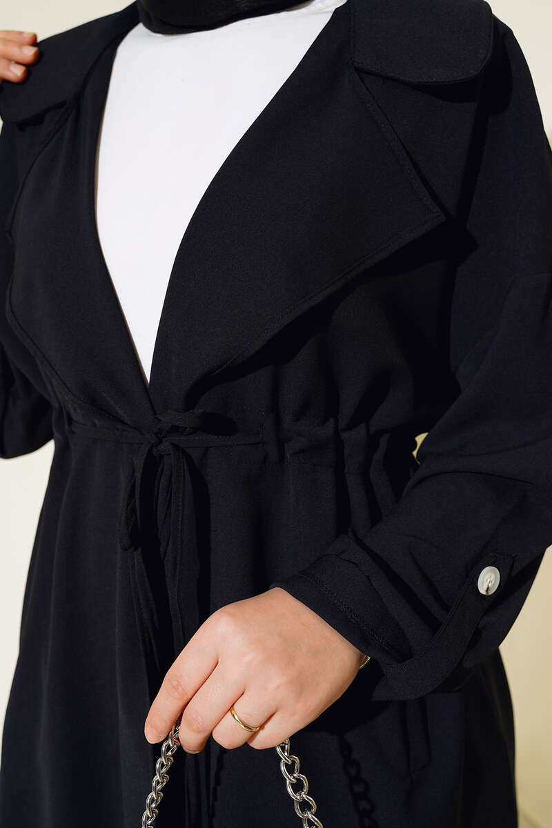 Bel Bağcıklı Kruvaze Yaka Kap Siyah