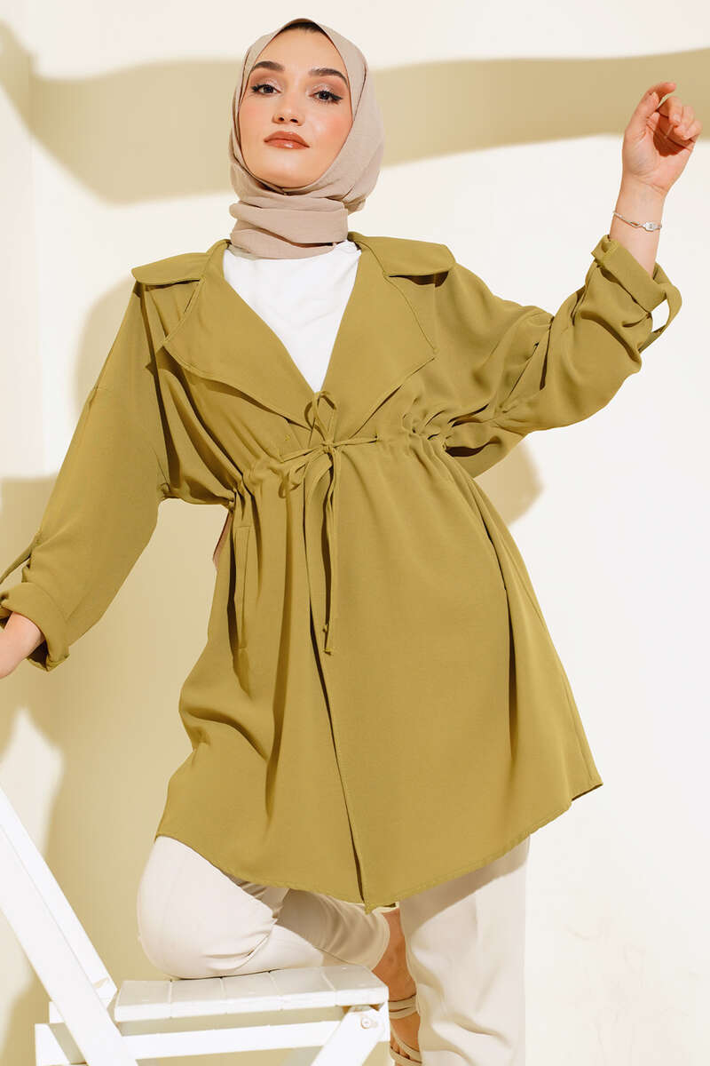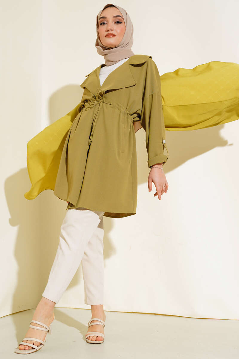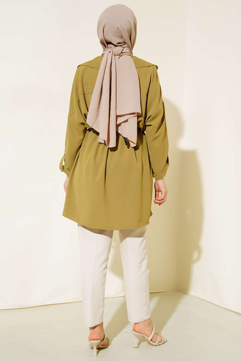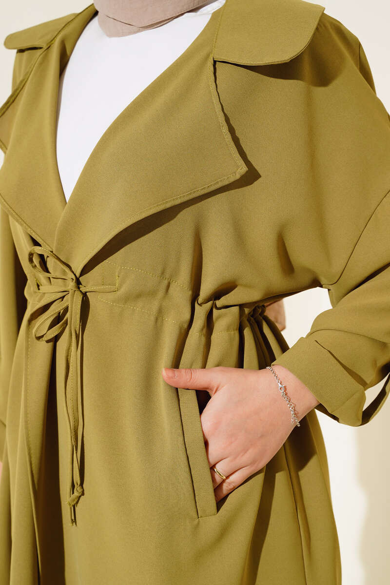 Bel Bağcıklı Kruvaze Yaka Kap Yağ Yeşili