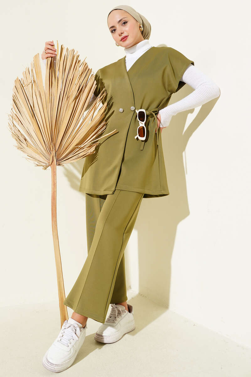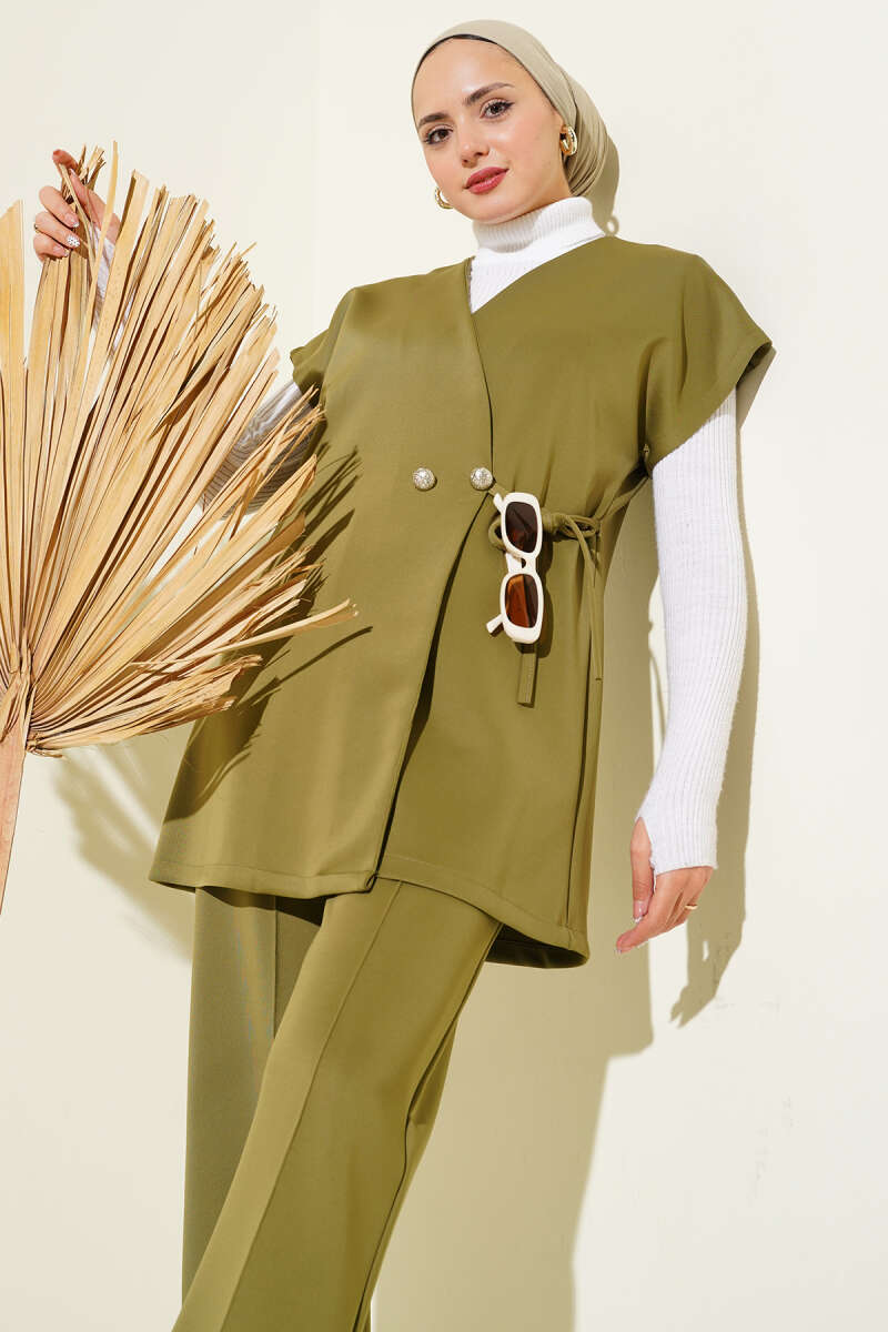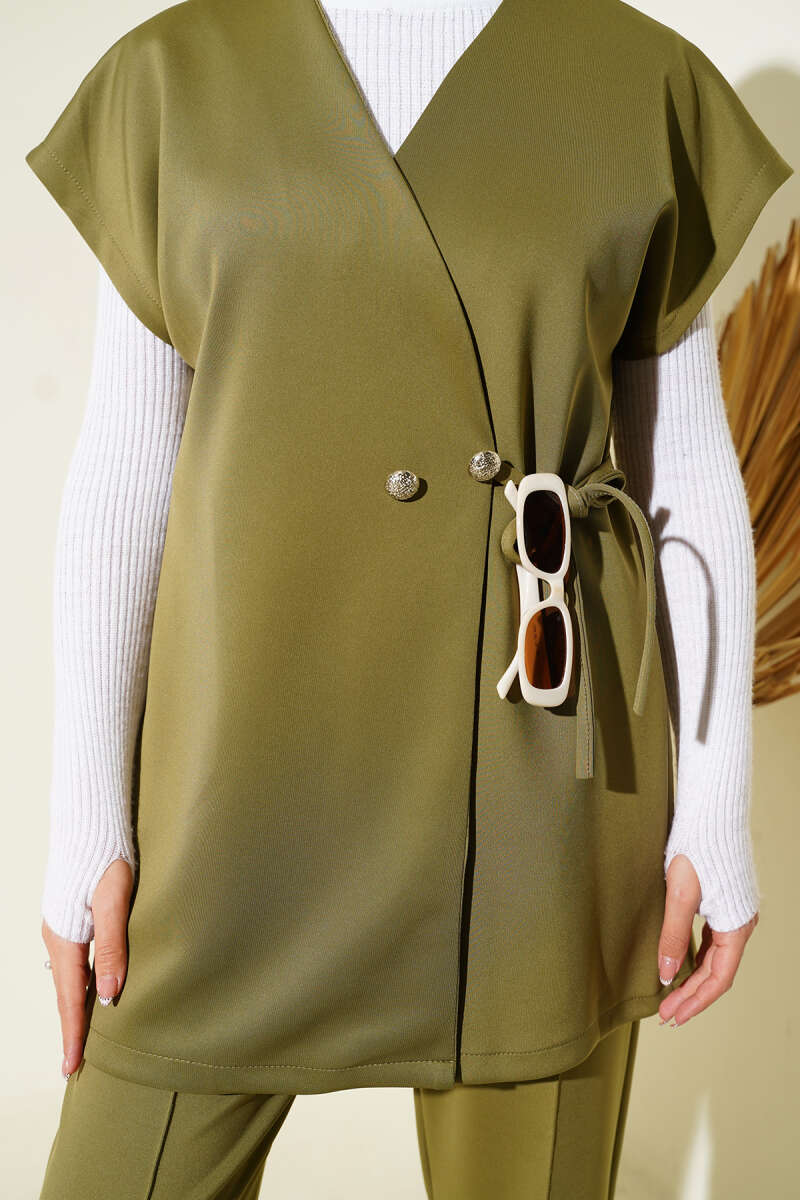 Kruvaze Yaka Yan Bağlamalı Yelekli Takım Lacivert