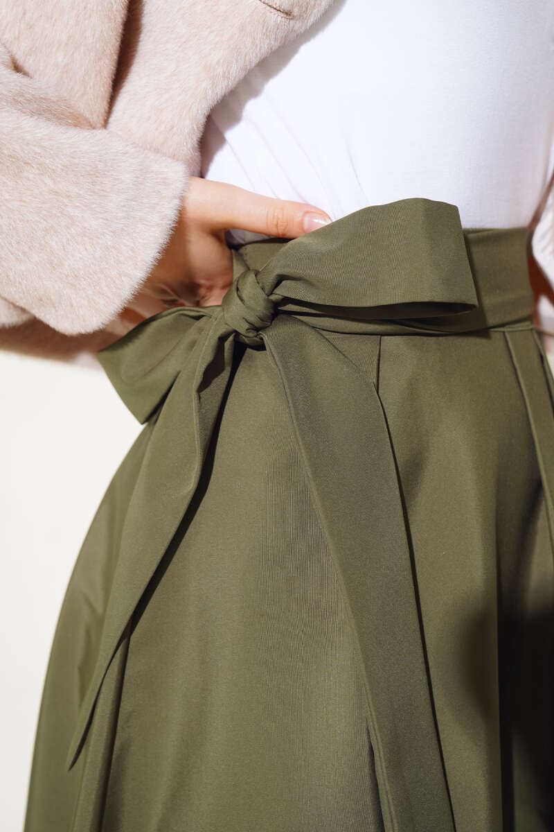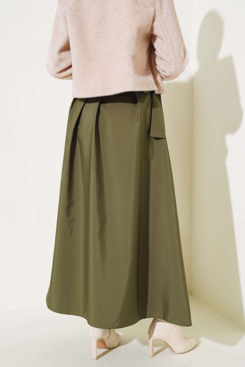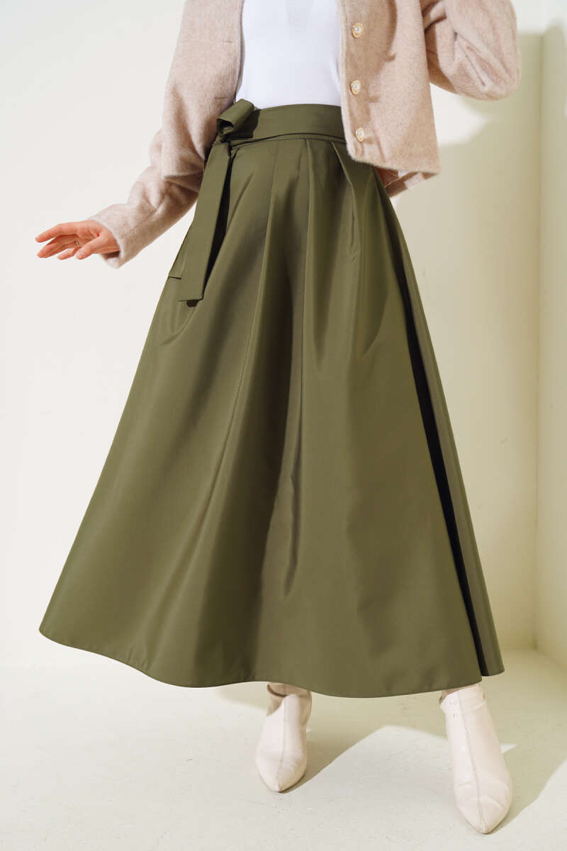 Kemerli Ekose Desenli Etek Haki