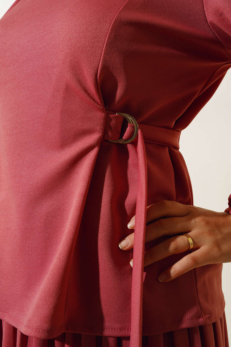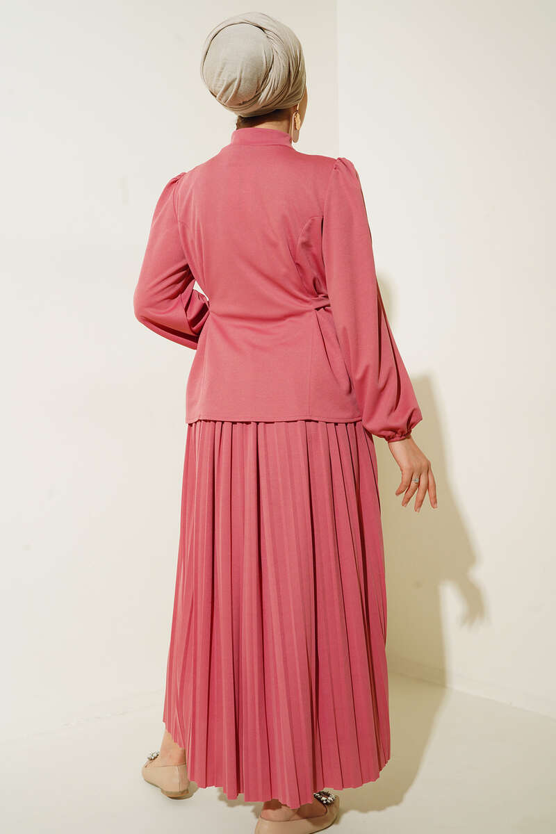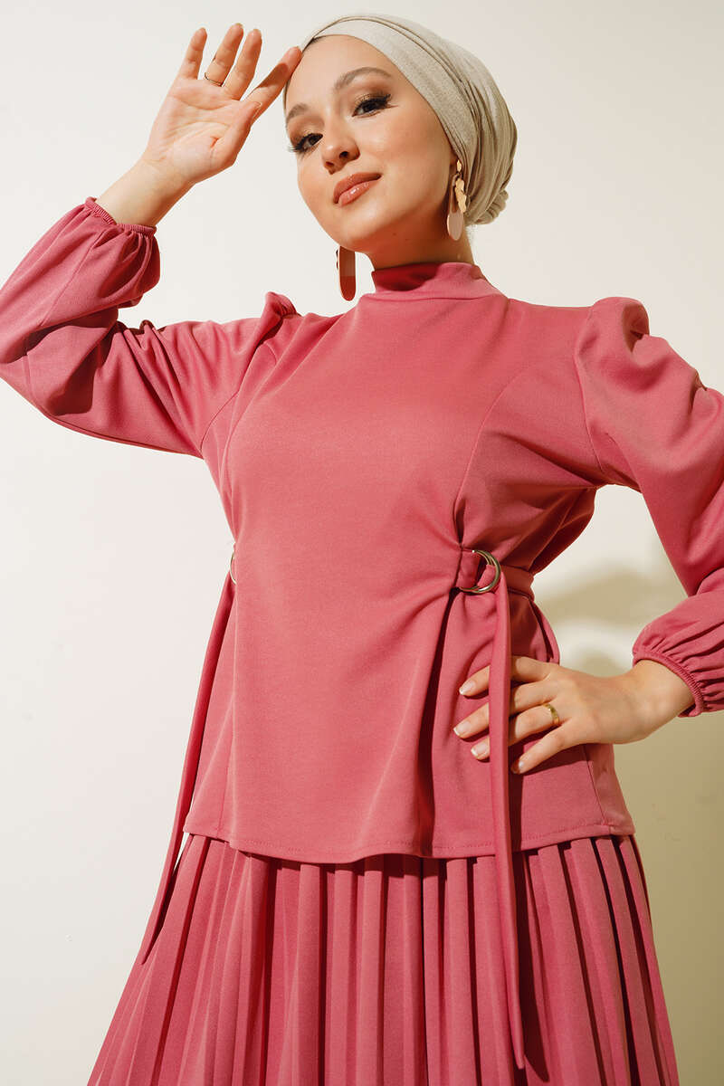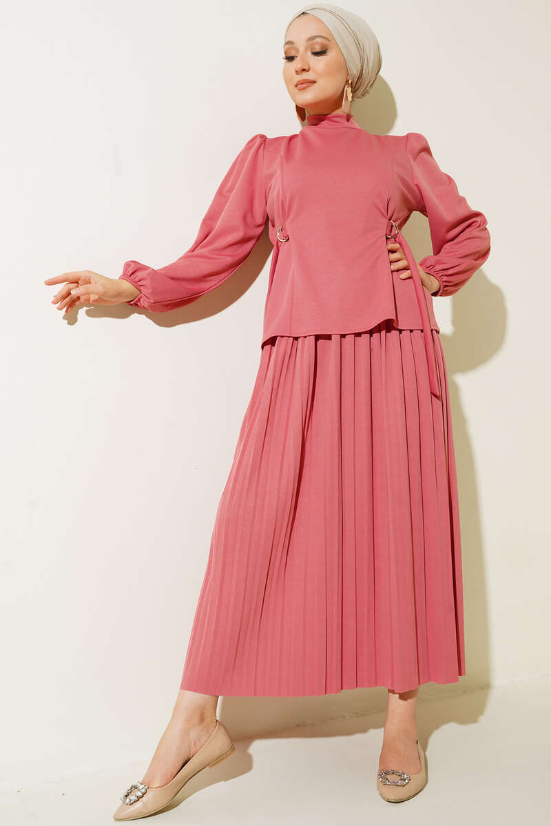 Bel Bağlamalı Eteği Pliseli İkili Takım Gül Kurusu