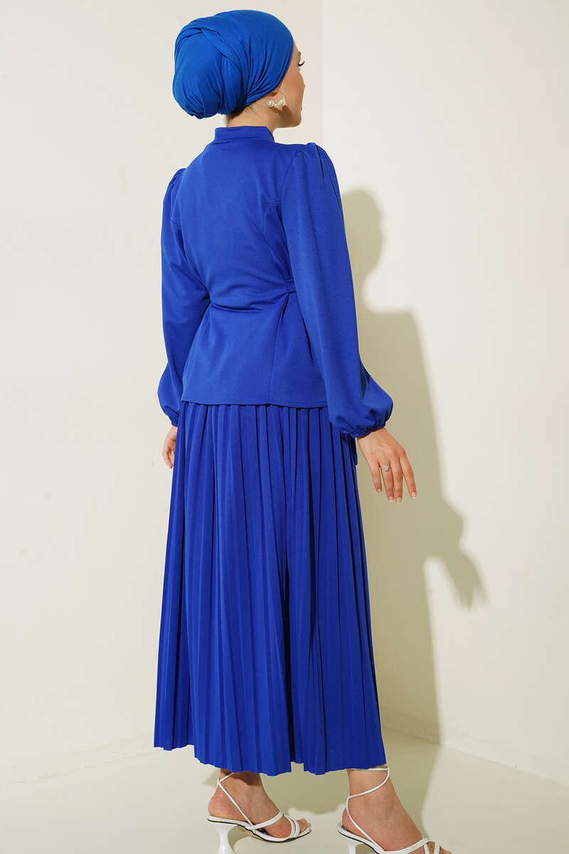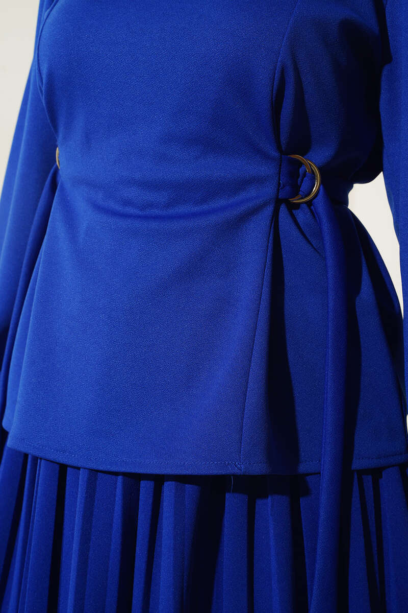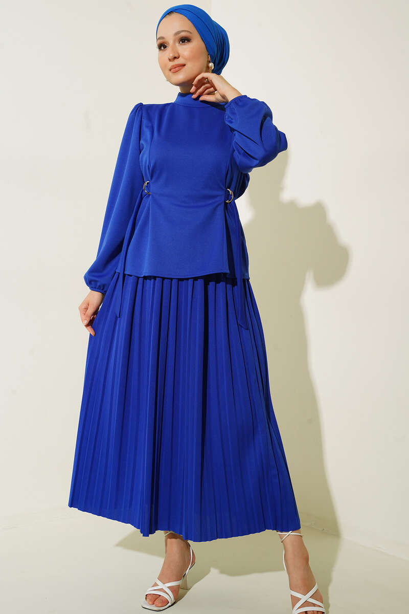 Bel Bağlamalı Eteği Pliseli İkili Takım Saks