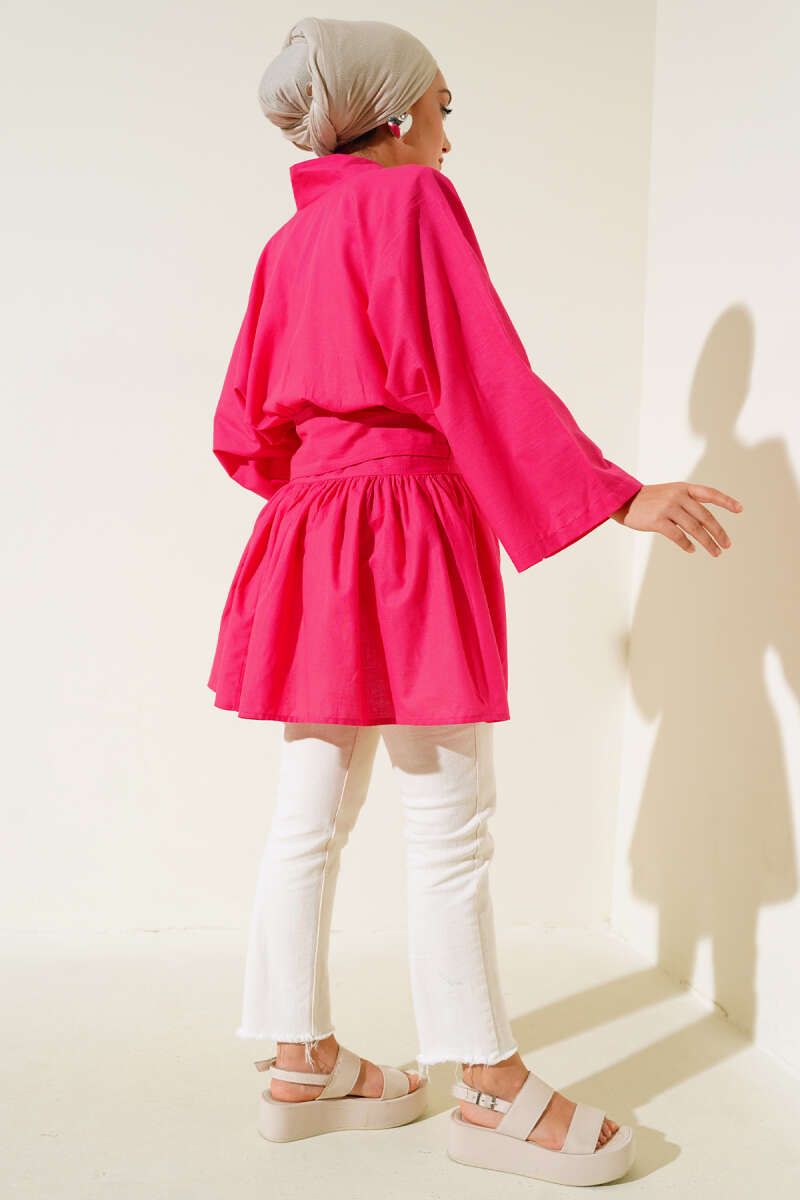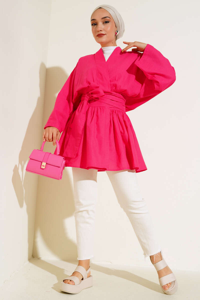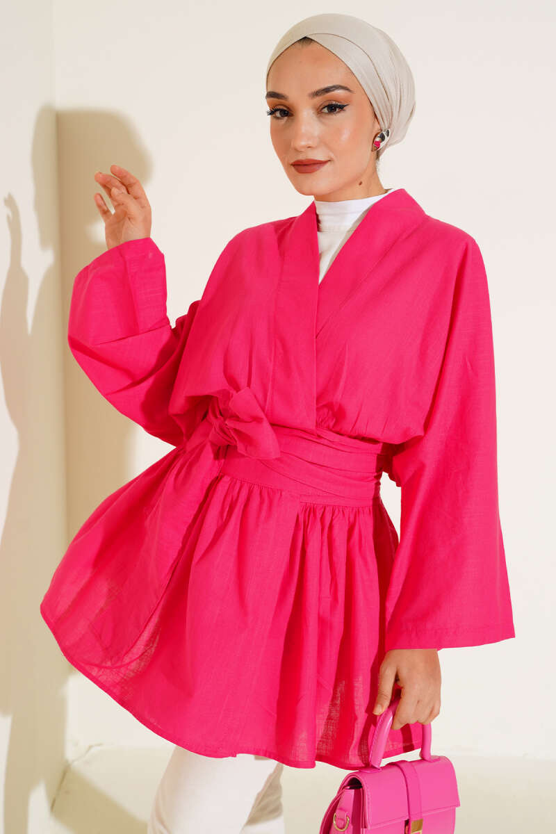 Bel Bağlamalı Keten Kimono Fusya