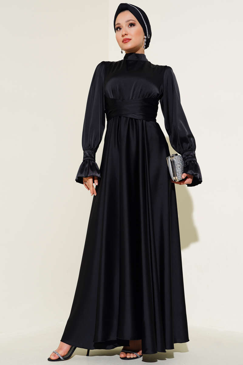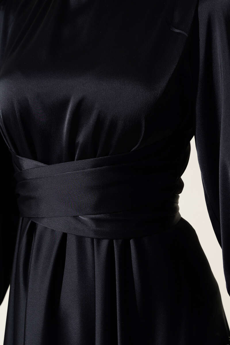 Bel Bağlamalı Kol Pileli Elbise Siyah
