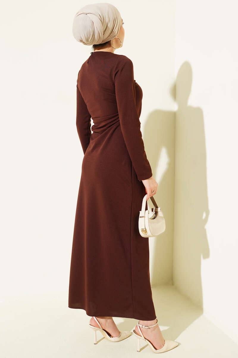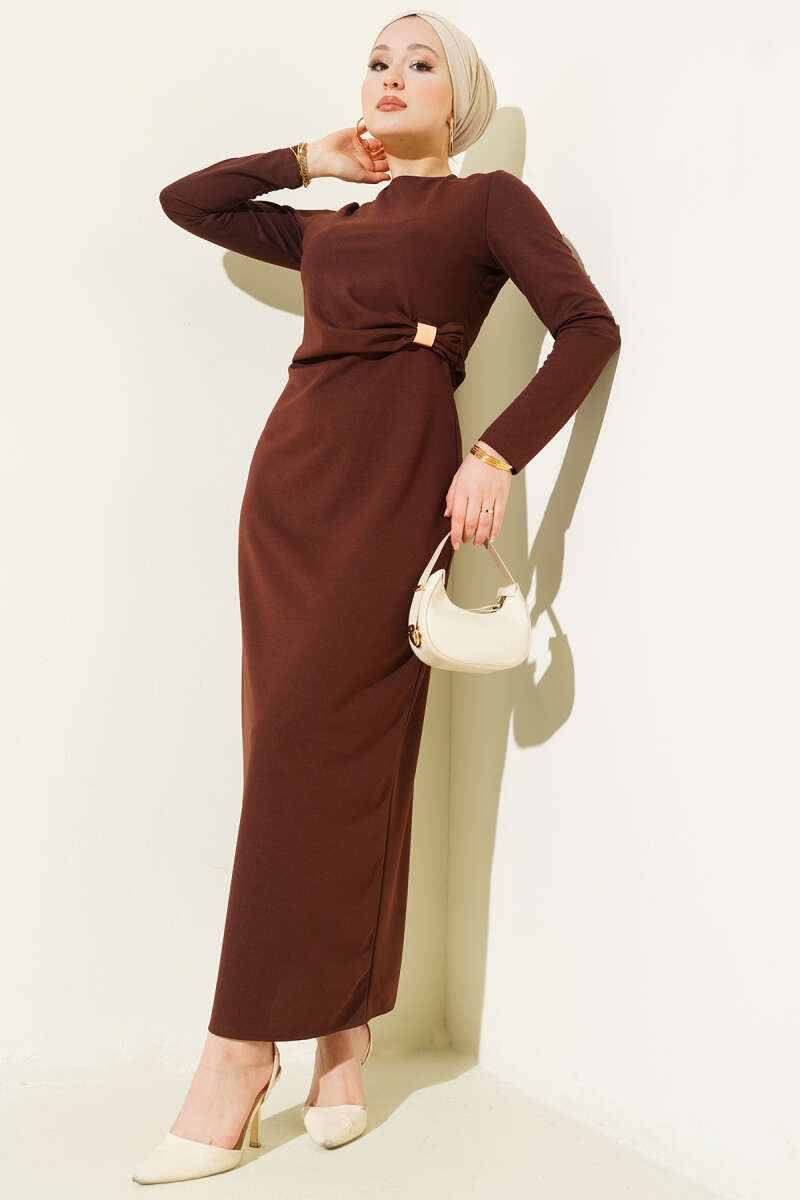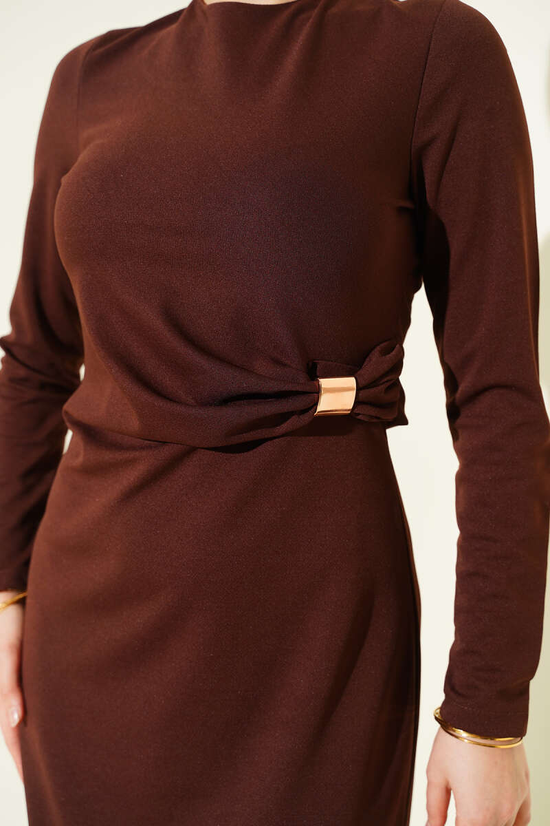 Duble Kol İp Bağcıklı Elbise Kahve