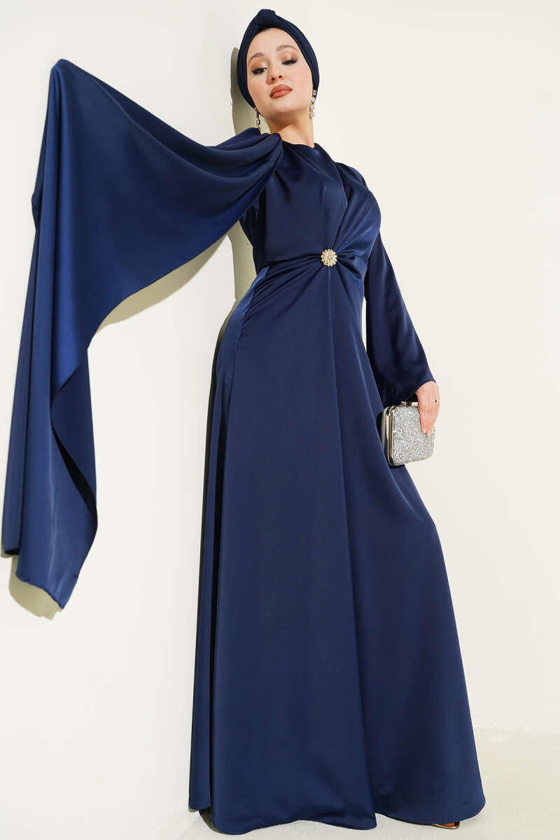 Bel Büzgü Detaylı Saten Abiye Elbise Siyah