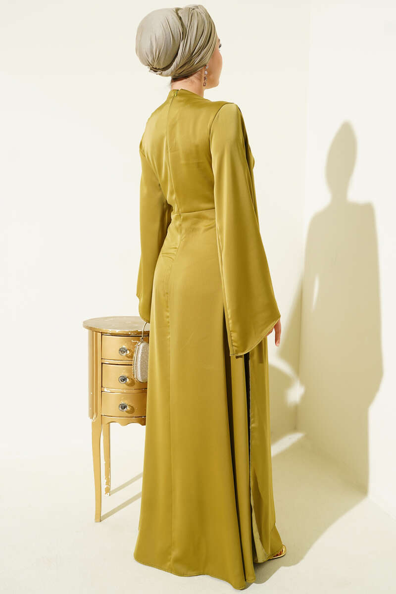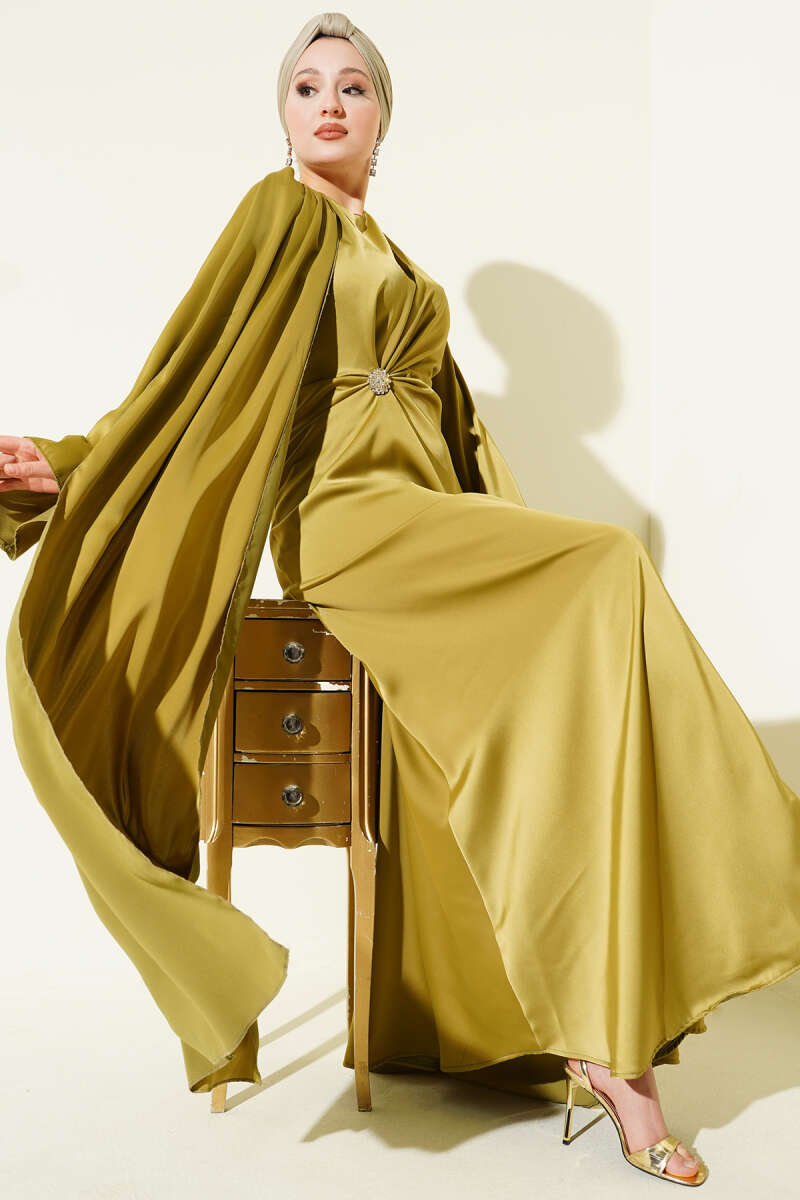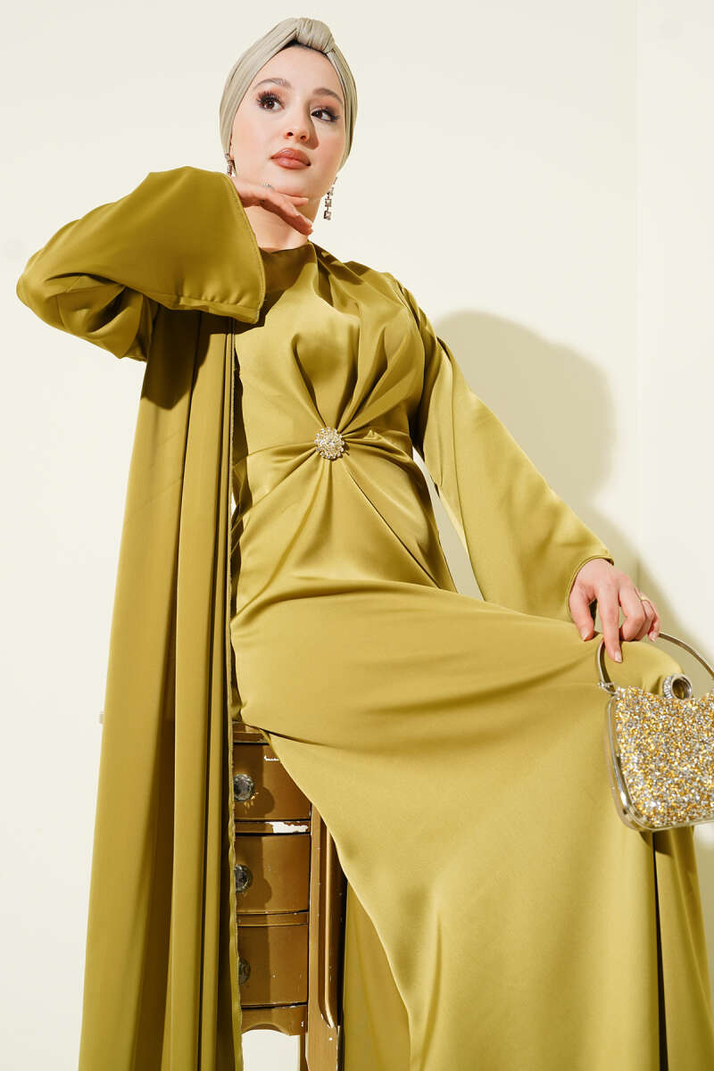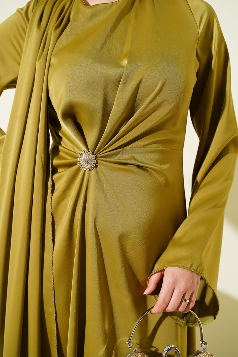 Bel Büzgü Detaylı Saten Abiye Elbise Haki