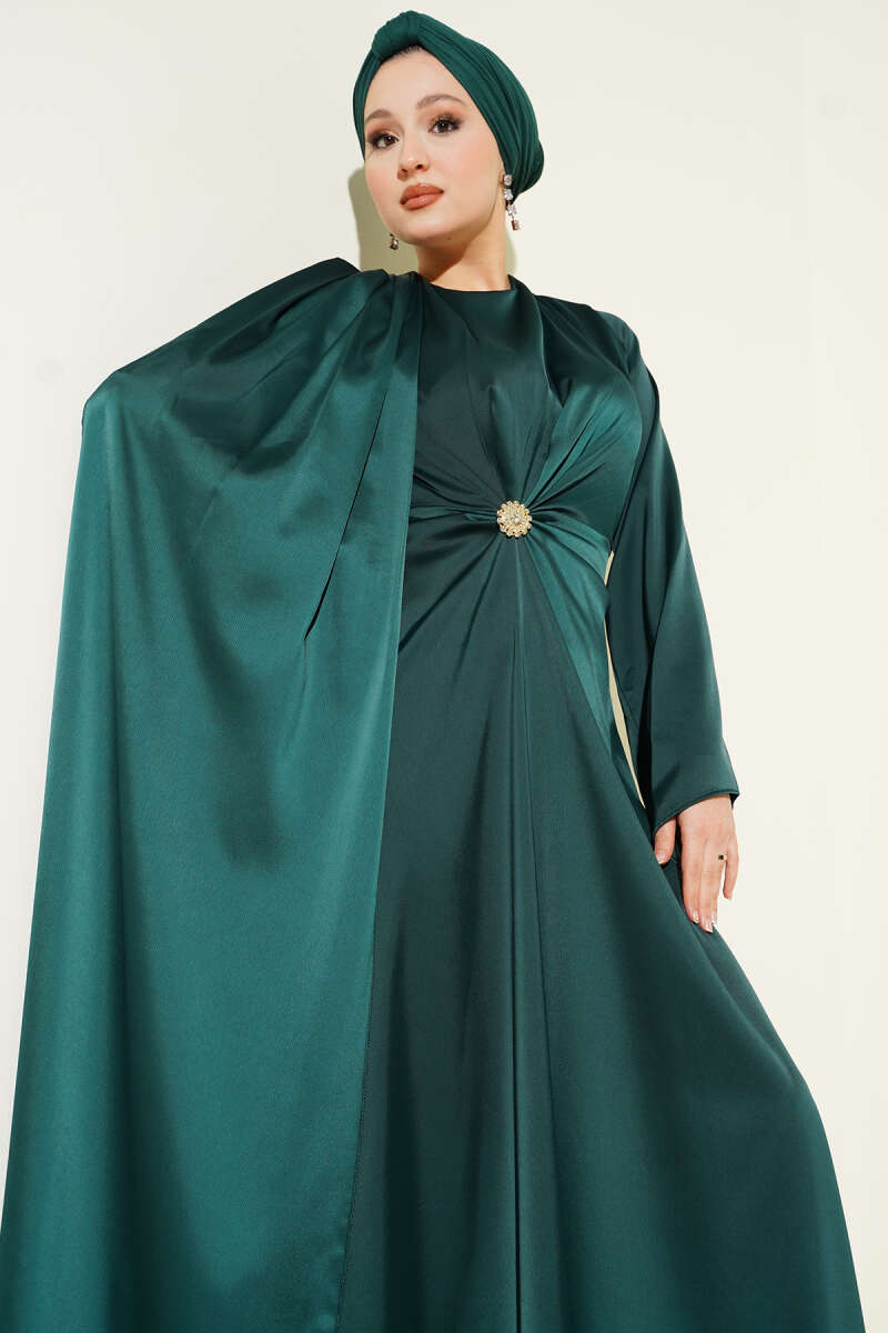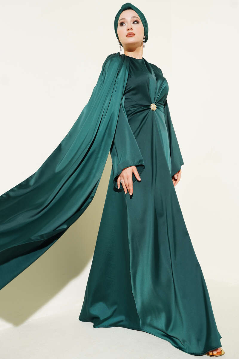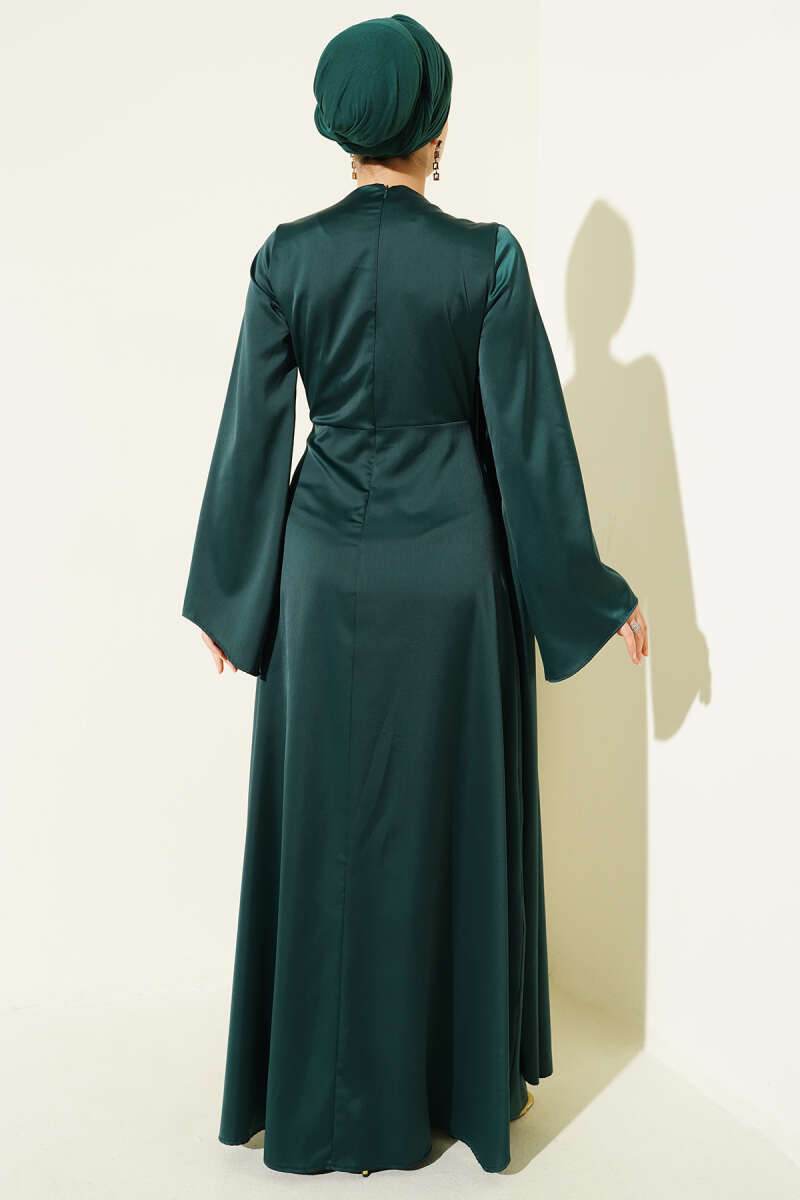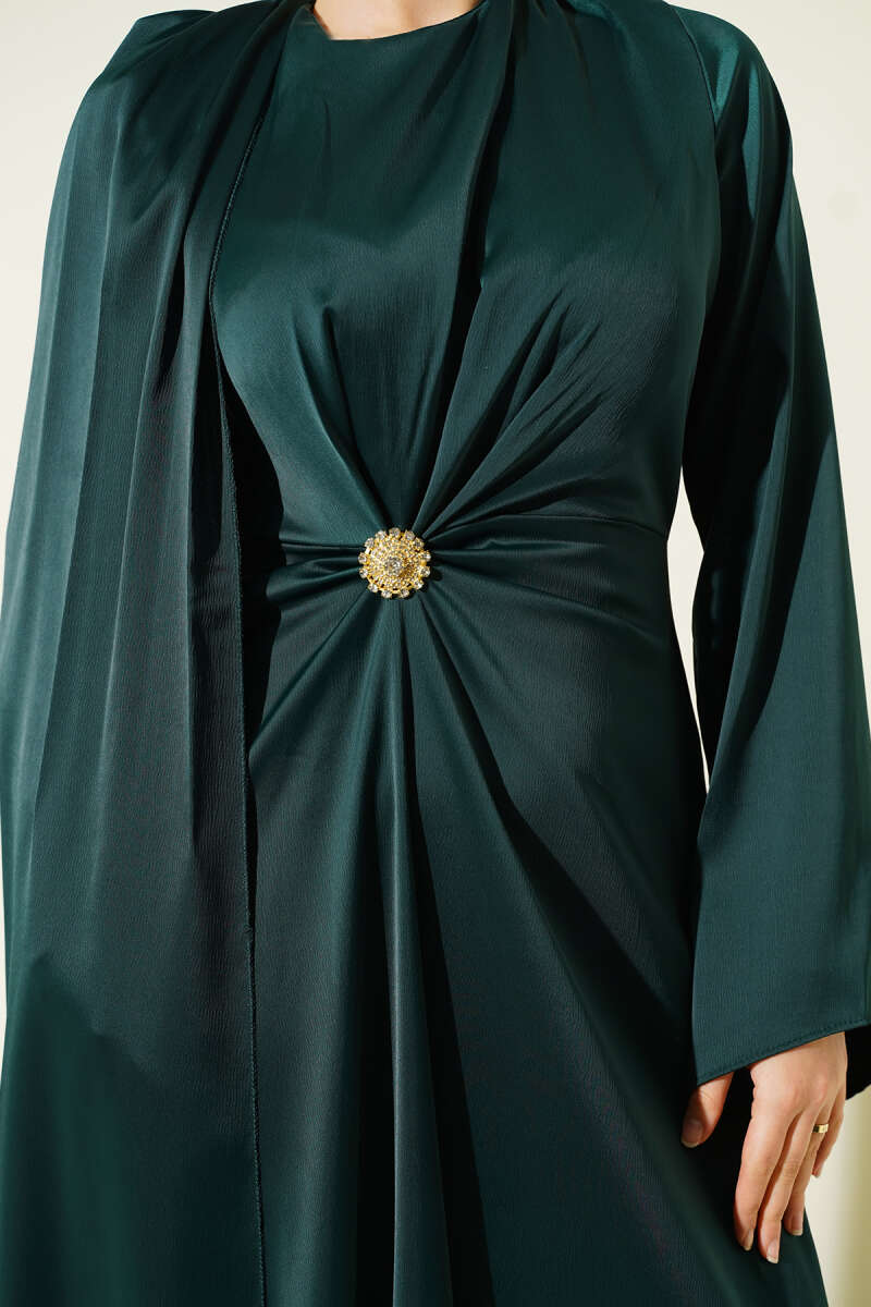 Bel Büzgü Detaylı Saten Abiye Elbise Yağ Yeşili
