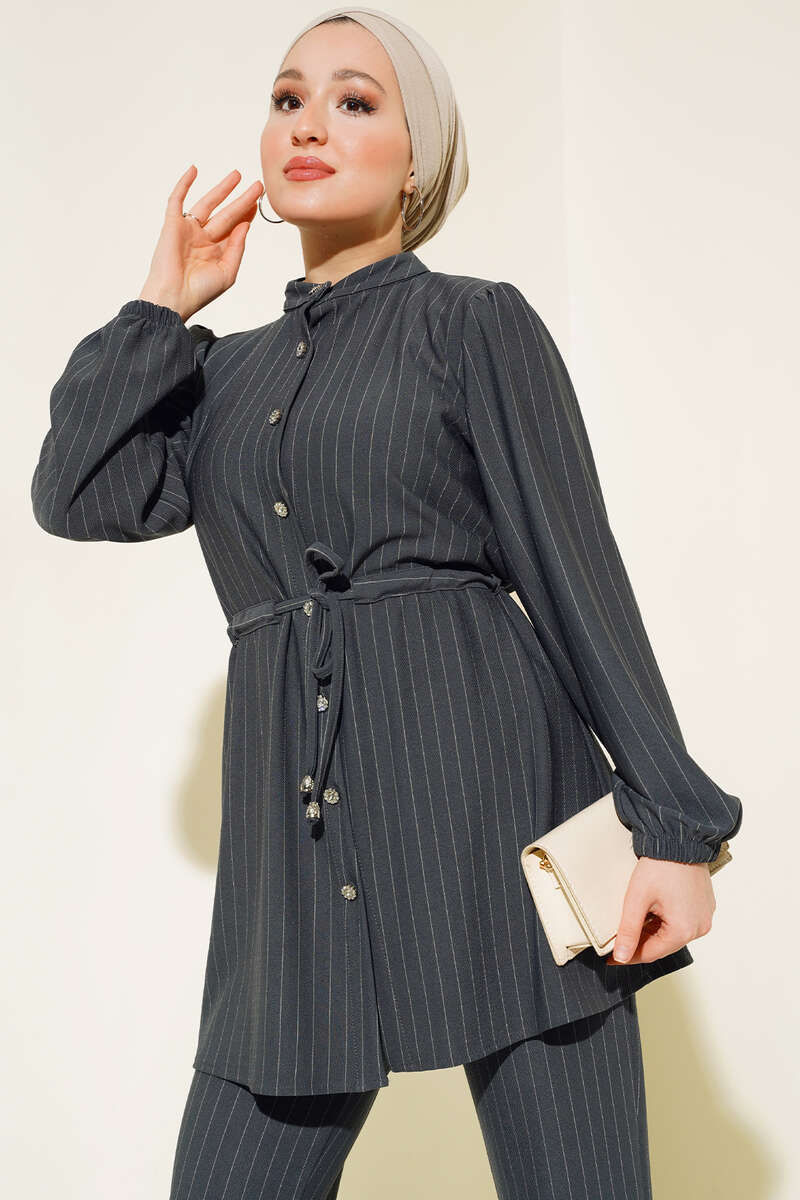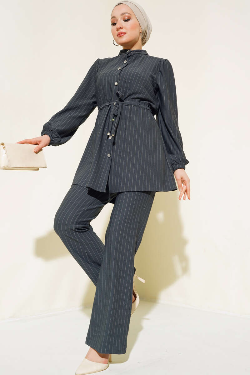 Bel Büzgülü Çizgili Takım Füme