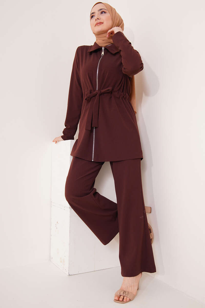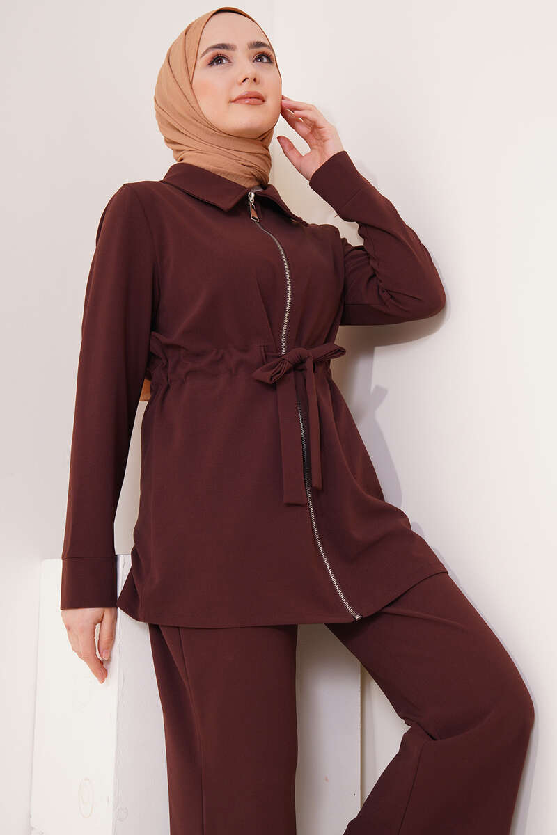 Yeni sezon ikili takımımız tasarımıyla dikkat çekmektedir. Takımımızın üstü hırkadır. Sportif bir görünüme sahiptir. Hırkamızın önü fermuarlıdır. Beli büzgülenebilir kuşaklıdır. Pantolon beli lastikli cepsiz modeldir. Takımımız oldukça rahattır. Her ortamda rahatlıkla giyebilirsiniz. Farklı renk seçenekleri mevcuttur.