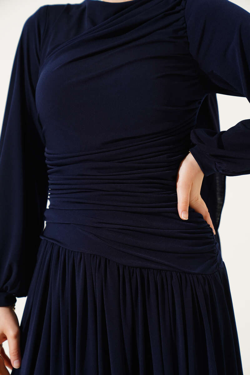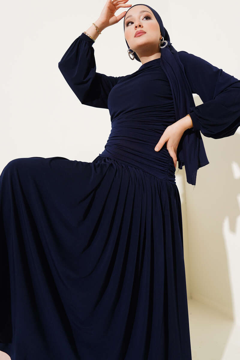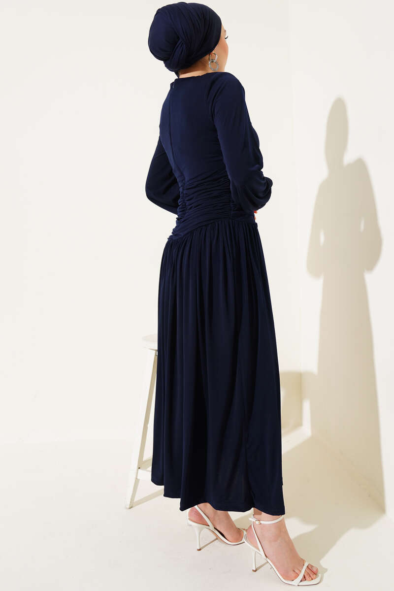 Omuz Pelerinli Taş Detaylı Abiye Elbise Lacivert