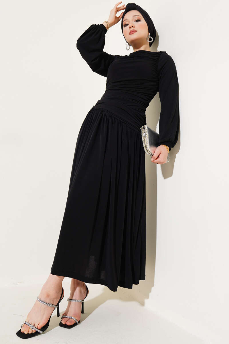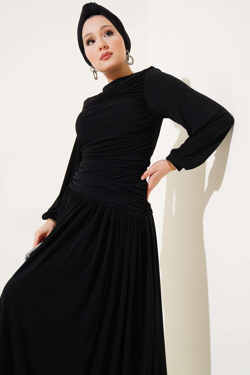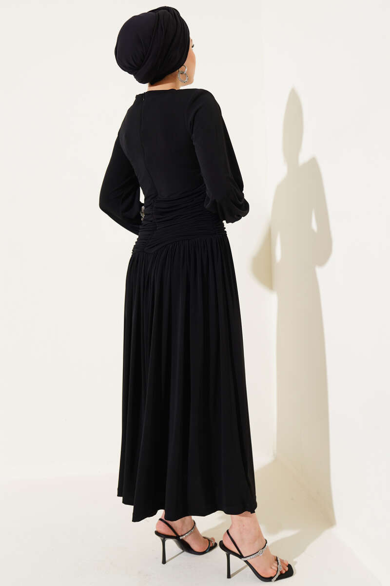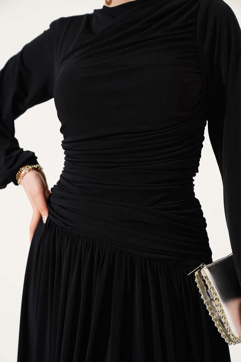 Omuz Pelerinli Taş Detaylı Abiye Elbise Siyah