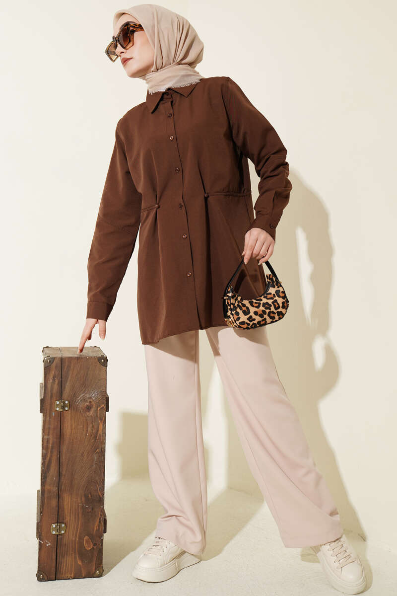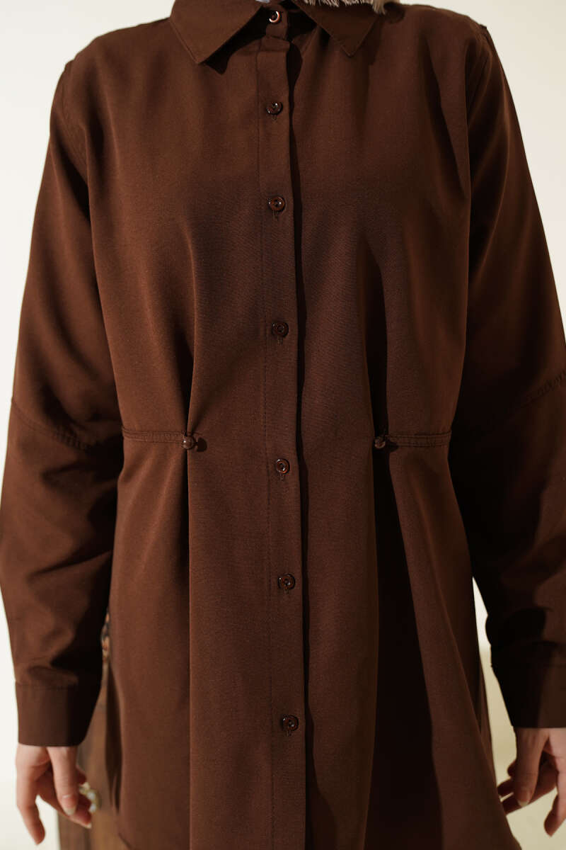 Bel kısmında yer alan düğmeli ve pileli detayları ile klasik gömlek formuna modern bir hareketlilik kazandırarak vücut hatlarını zarifçe vurgular. Gömlek yaka tasarımı ve boydan düğmeli yapısı, hem resmi hem de günlük kombinler için çok yönlü bir kullanım avantajı sunar. Kaliteli dokusu ve hafif dökümlü kesimi, gün boyu konfor sağlarken stilinize sofistike ve düzenli bir görünüm katar.