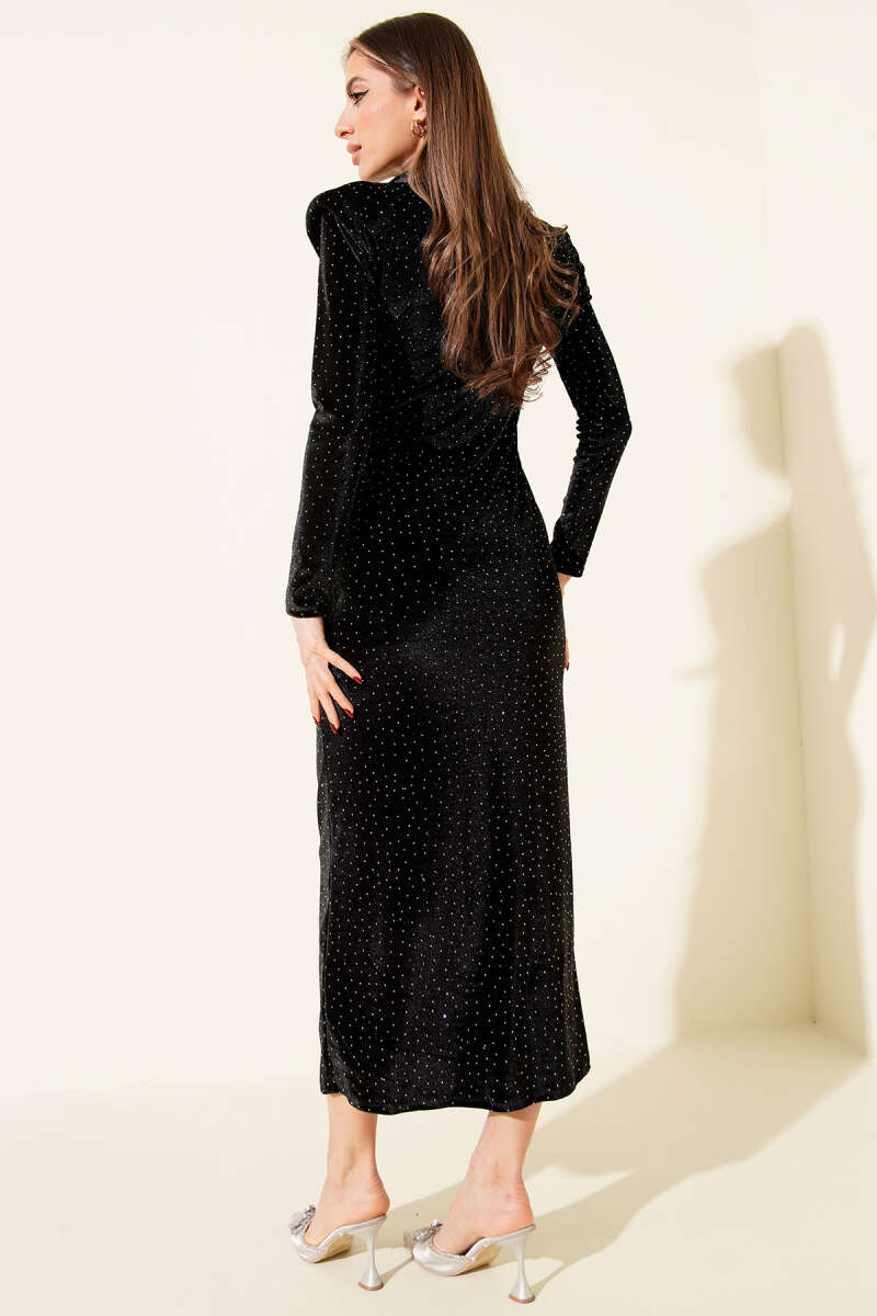Bel Düğmeli Taşlı Midi Kadife Elbise Siyah