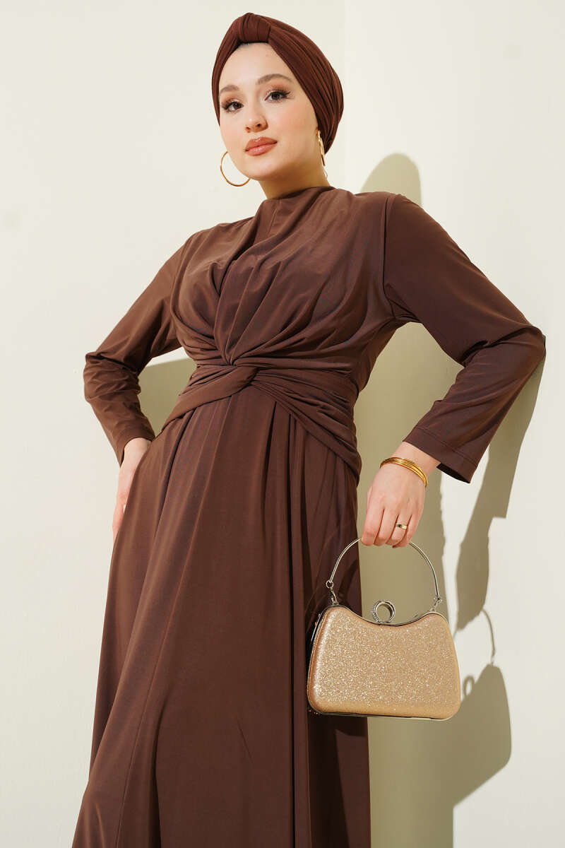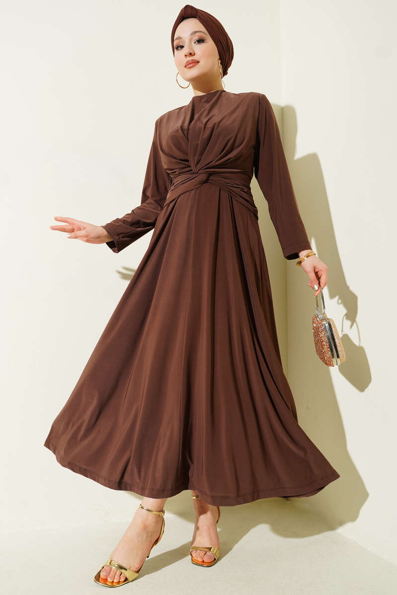 Bel Büzgülü Bağlamalı Elbise Kahve