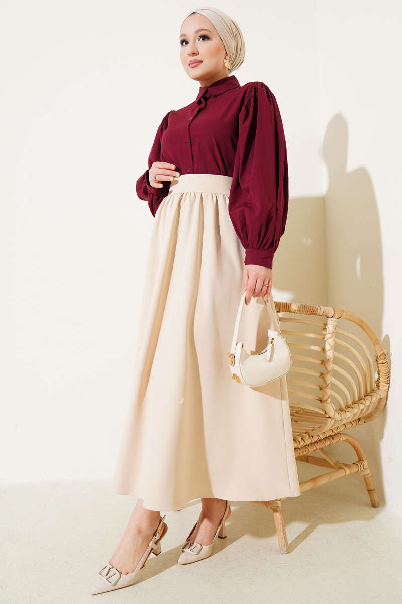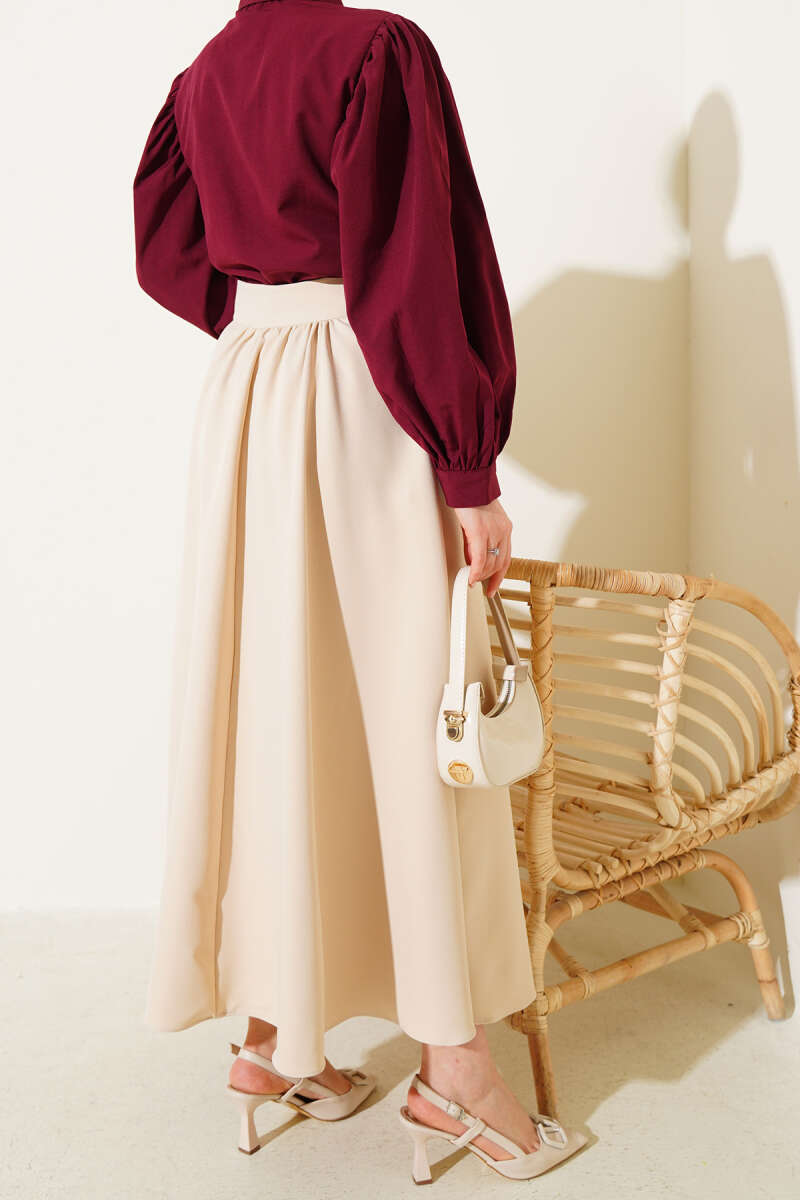 Beli Lastik Detaylı Kloş Scuba Etek Bordo