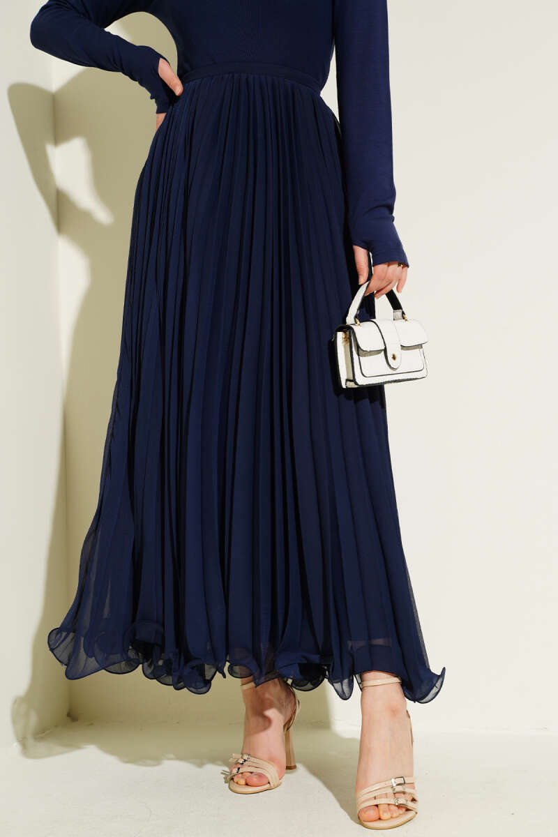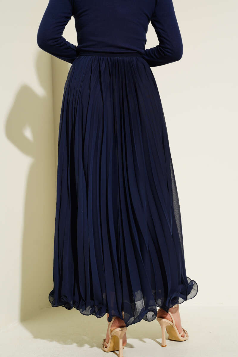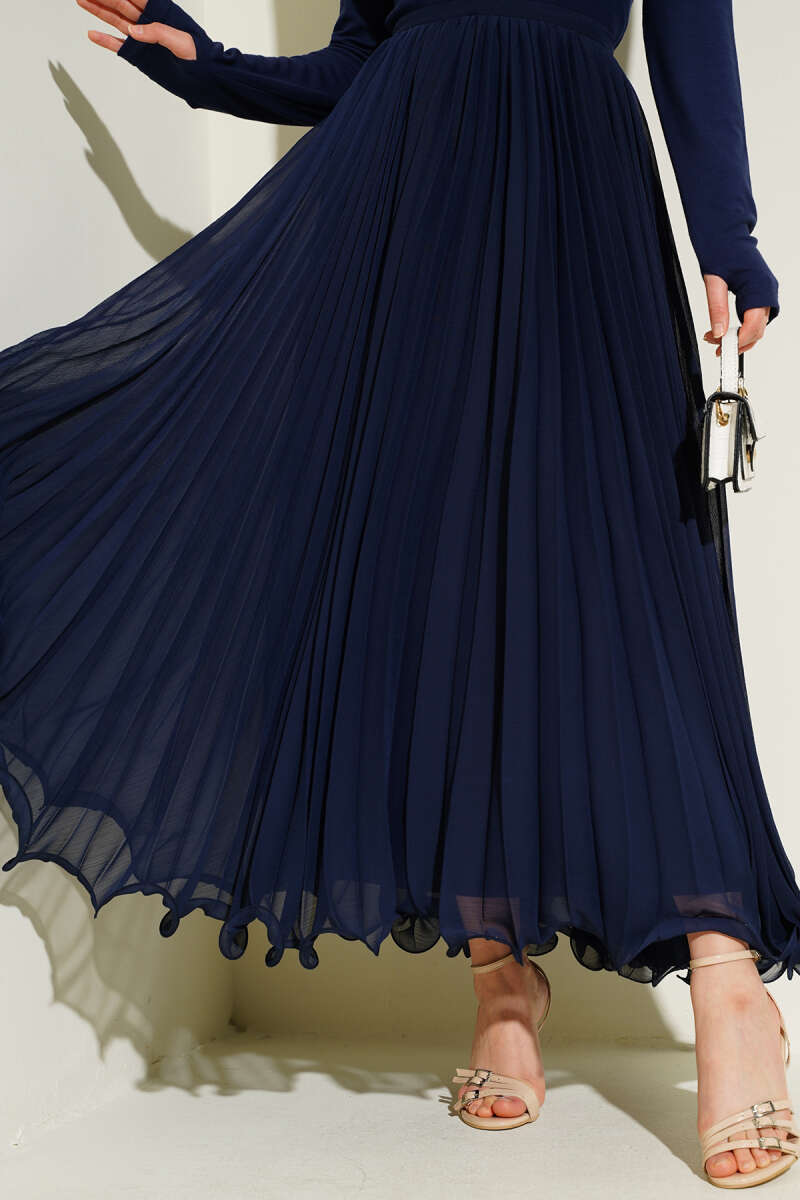 Bel Fermuarlı Şifon Pileli Etek Lacivert