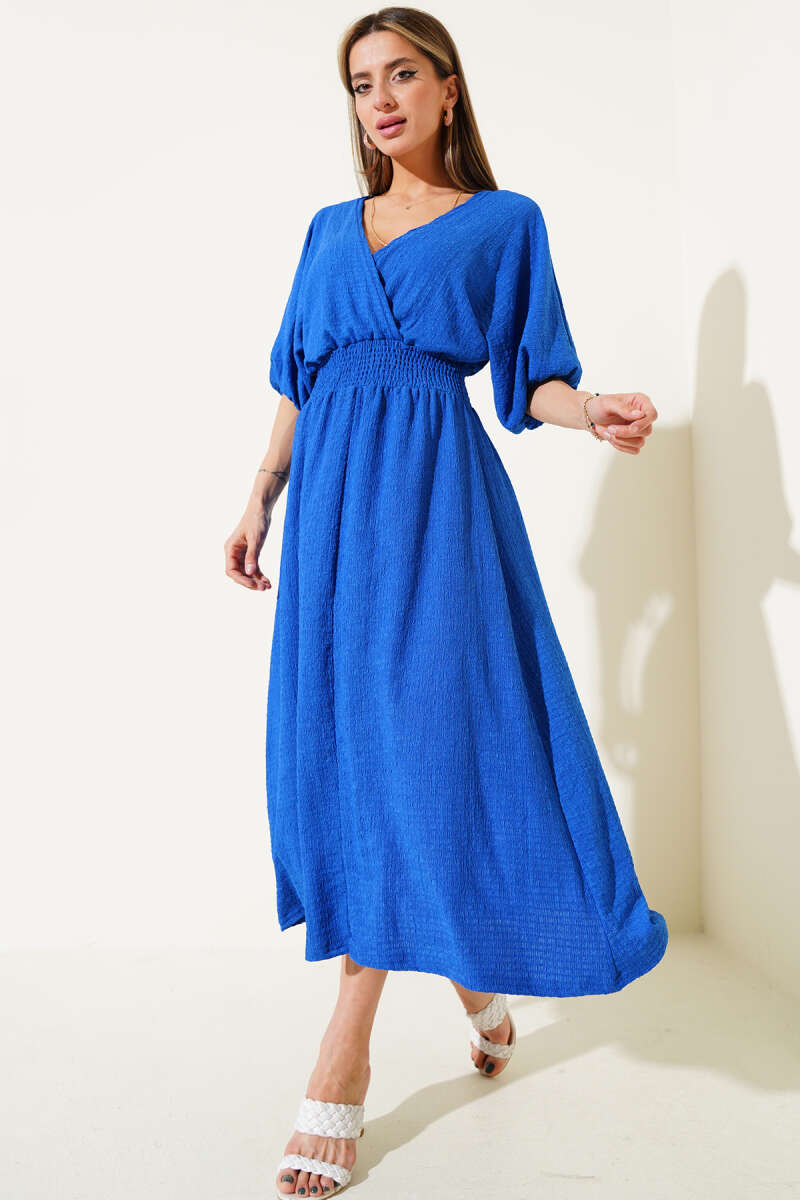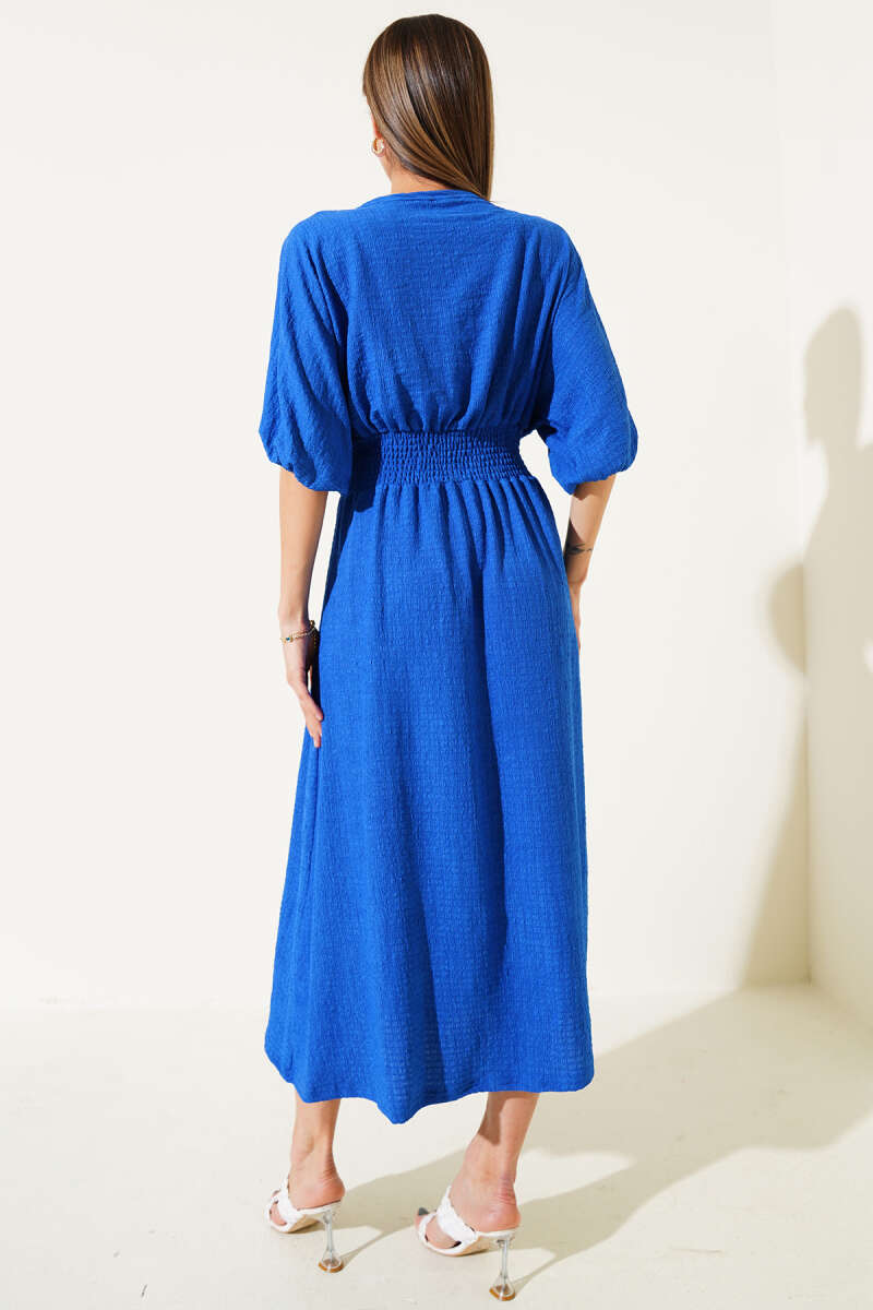 Bel Gipeli Yarım Kol Kırınkıl Midi Elbise Saks