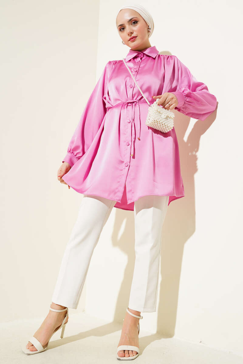 Gizli Düğmeli Bel Kuşaklı Gömlek Pembe