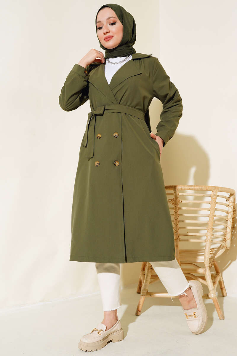 Yeni sezon trençkotumuz kombinlerinizin vazgeçilmez parçası olacaktır. Trençkotumuzun önü düğmelidir. Trençkotumuzun iki adet cebi bulunmaktadır. Kruvaze yakadır. Astarsızdır. Trençkotumuzun iki adet kemer köprüsü olup, kuşağı vardır. Renk seçenekleriyle dolabınızda yerini beklemektedir.
