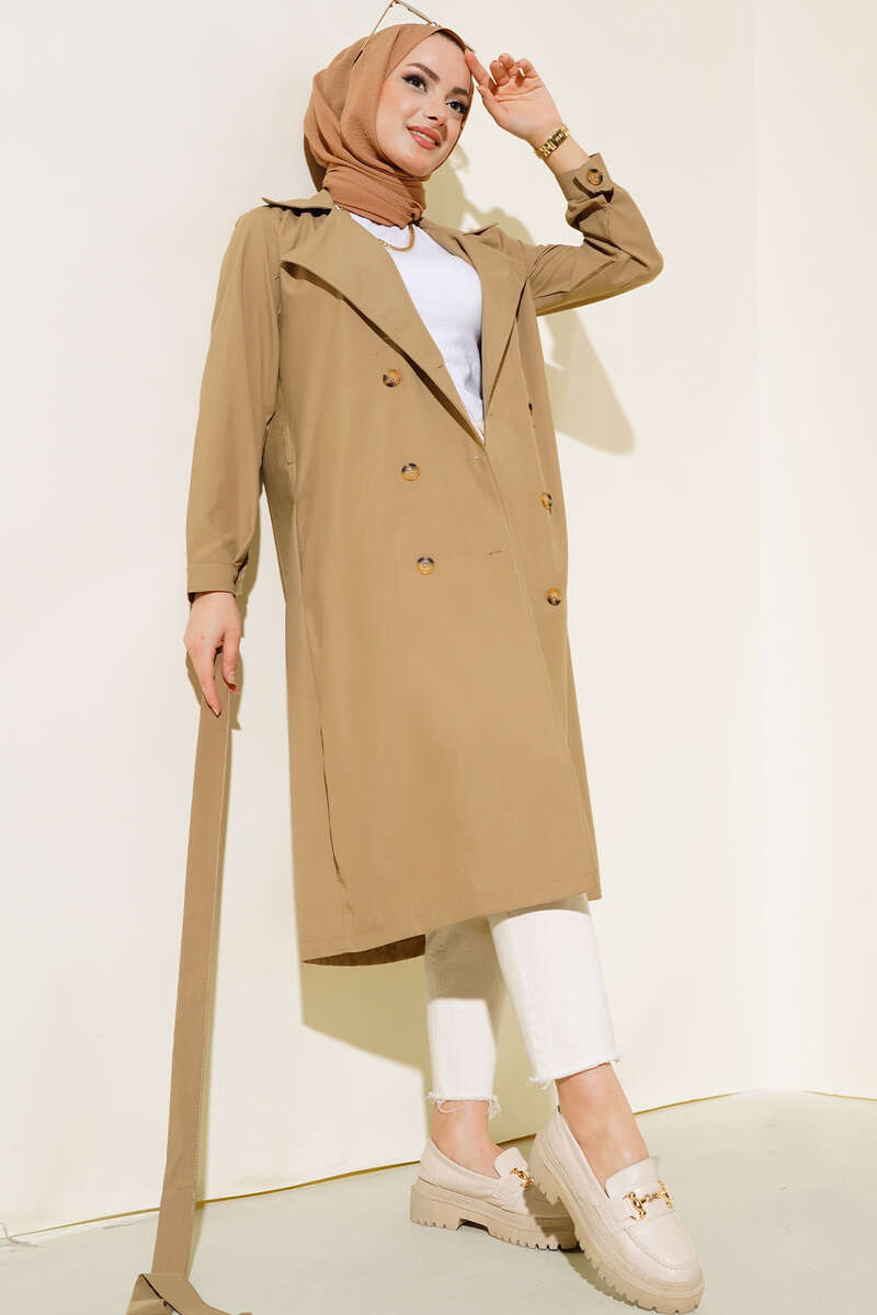 Yeni sezon trençkotumuz kombinlerinizin vazgeçilmez parçası olacaktır. Trençkotumuzun önü düğmelidir. Trençkotumuzun iki adet cebi bulunmaktadır. Kruvaze yakadır. Astarsızdır. Trençkotumuzun iki adet kemer köprüsü olup, kuşağı vardır. Renk seçenekleriyle dolabınızda yerini beklemektedir.