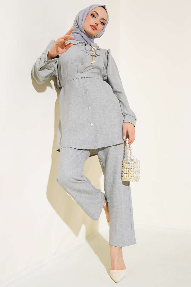 Yeni sezon ikili takım modelimiz sizlerle beraber. Tuniğimiz boydan düğmelidir. Kol bilekleri manşetli ve düğmelidir. Kendi kumaşından kuşağı vardır. Pantolonumuzun beli lastiklidir. Cepsizdir. Sade ve şık ikili takımımız özel günlerinizin favorisi olacak. Renk seçenekleri mevcuttur. Broş Aksesuar Olarak Kullanılmıştır.