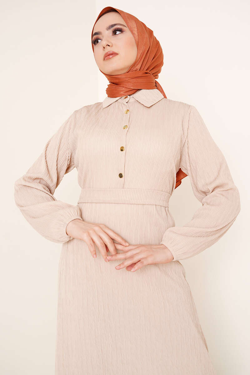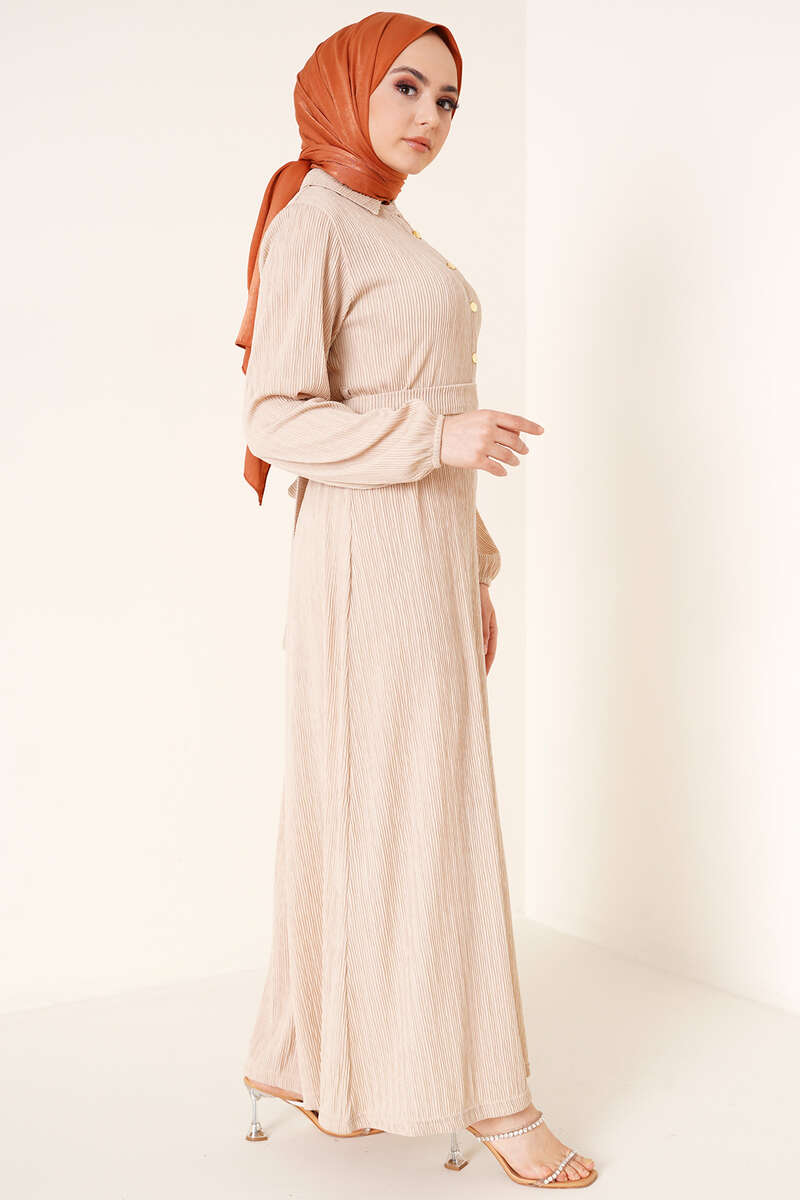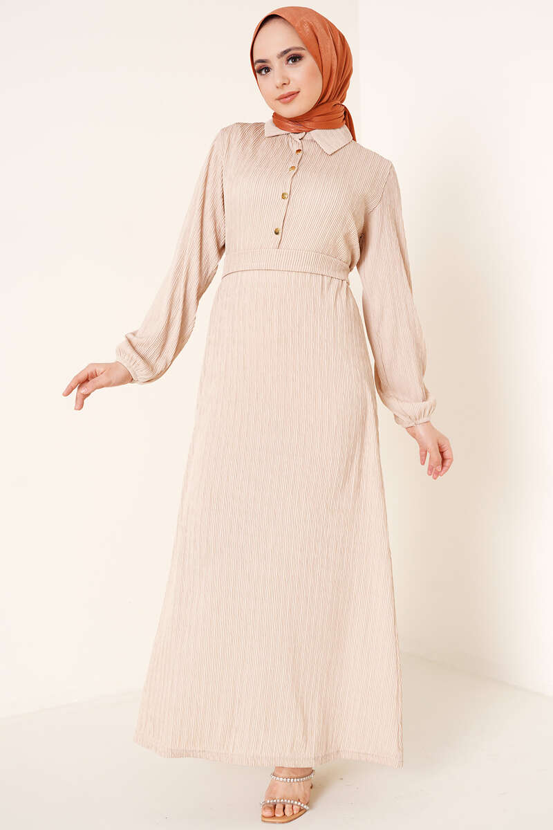 Bel Kuşaklı Klasik Yaka Elbise Bej