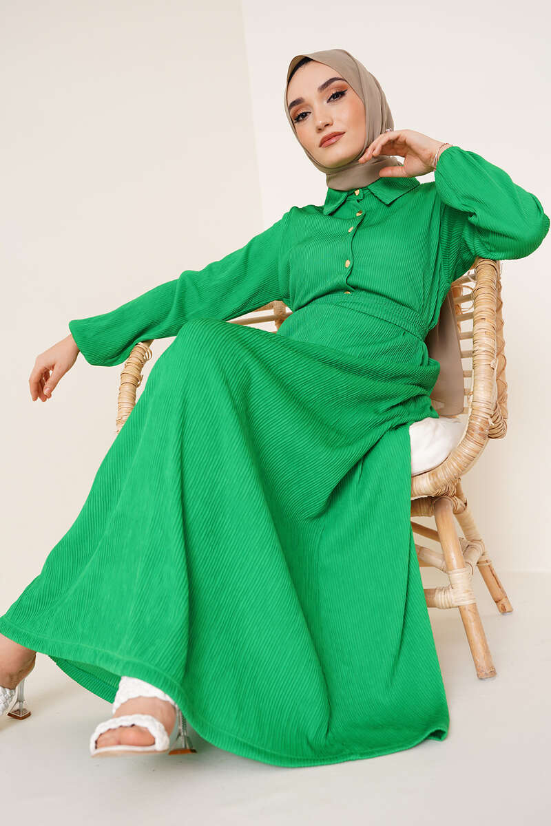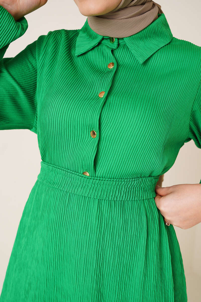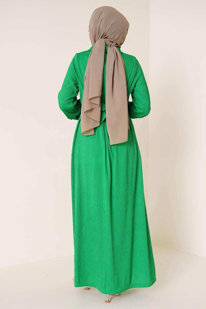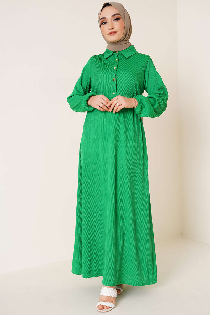 Yeni sezon piliseli örme kumaş elbisemiz bel kuşaklıdır. İki adet kemer köprüsü bulunmaktadır. Klasik yaka olan elbisemizin önü yarım düğmelidir. Elbisemizin bilekleri lastikldiir.