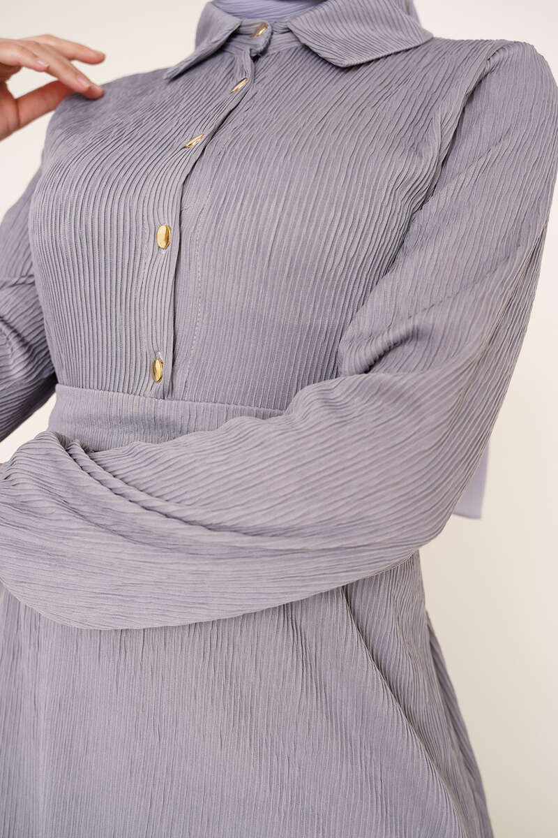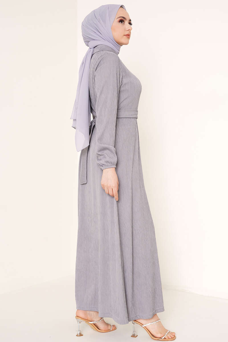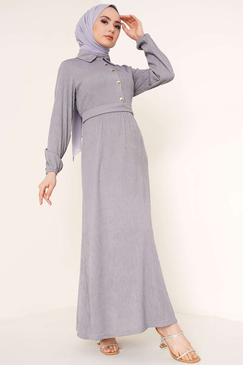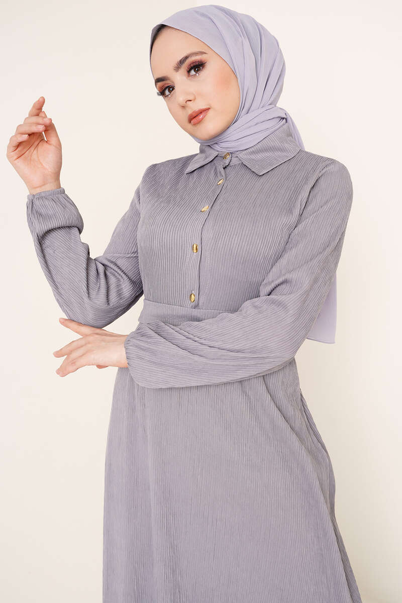 Yeni sezon piliseli örme kumaş elbisemiz bel kuşaklıdır. İki adet kemer köprüsü bulunmaktadır. Klasik yaka olan elbisemizin önü yarım düğmelidir. Elbisemizin bilekleri lastikldiir.