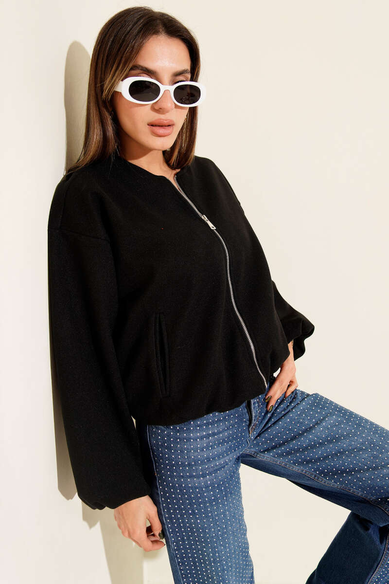 Bel Lastik Detaylı Kaşe Ceket Siyah
