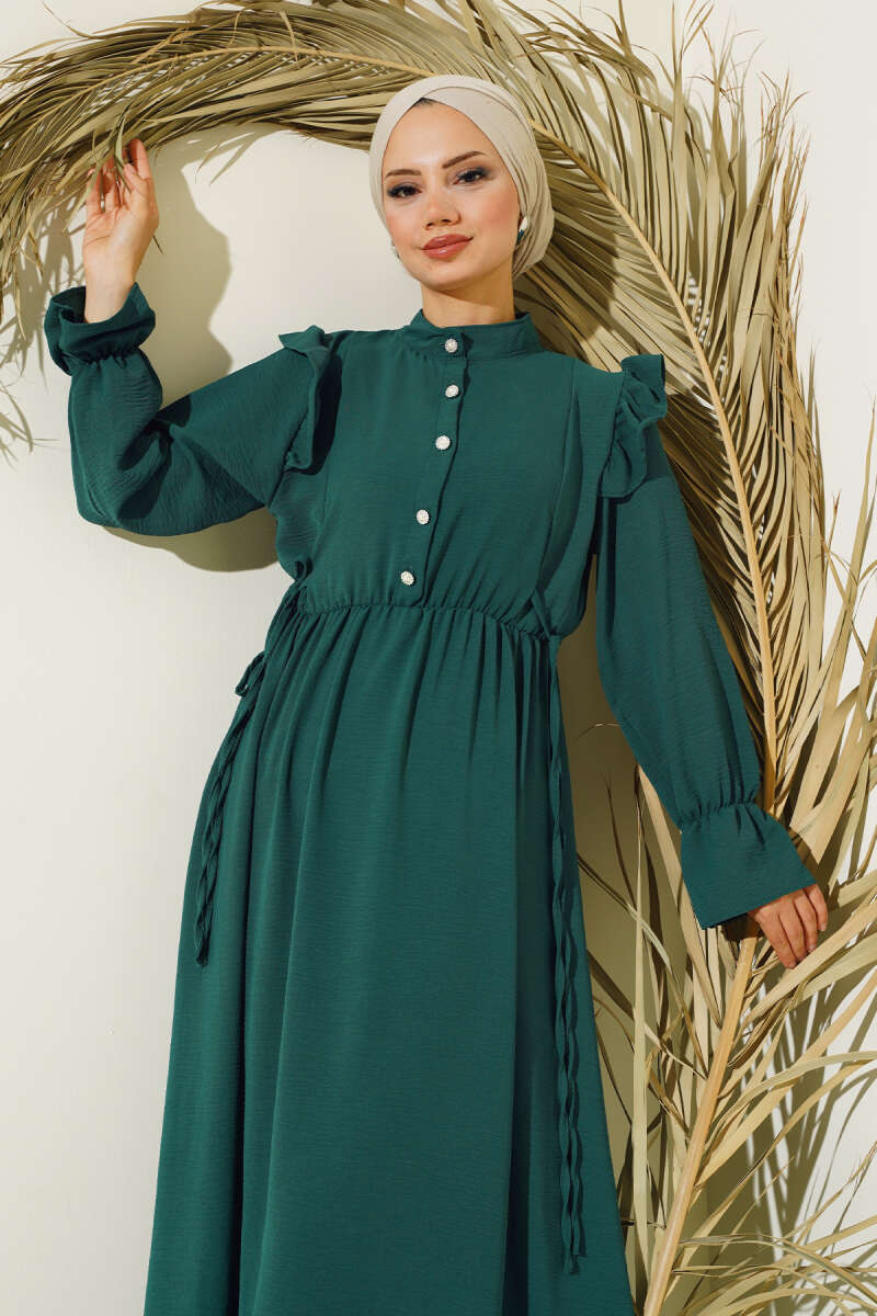 Çizgi Gömlek Garnili Triko Elbise Kahve