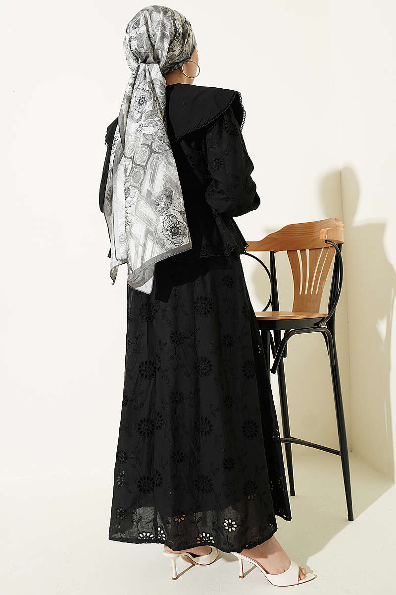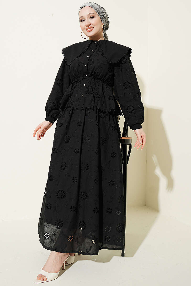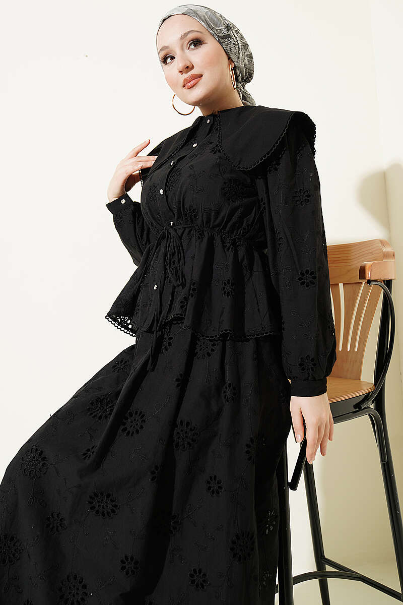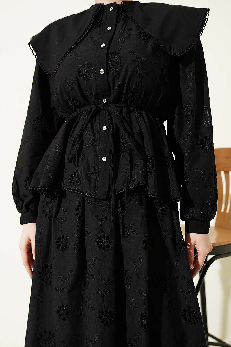 Bel Lastikli Bebe Yaka Brodeli Etekli Takım Siyah