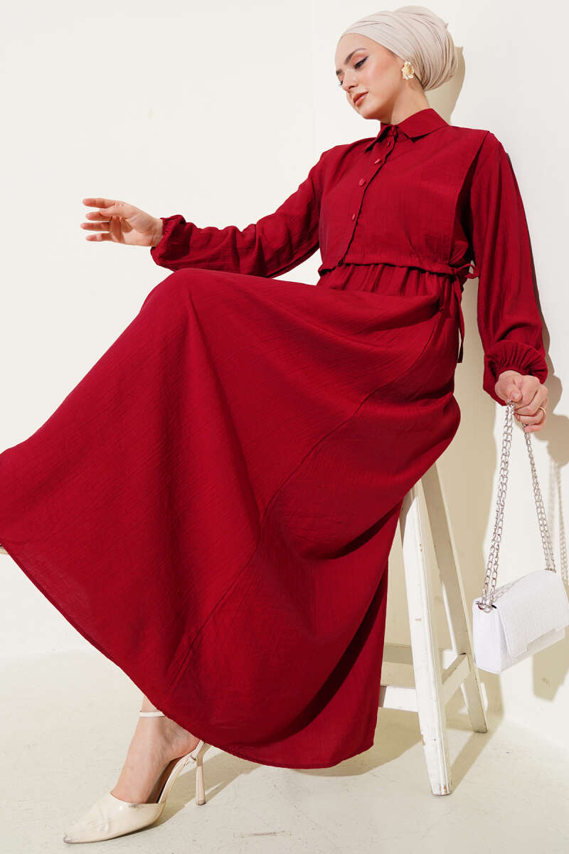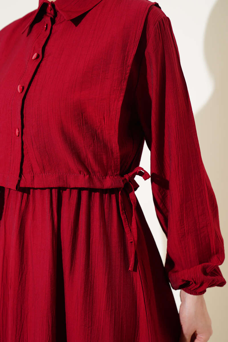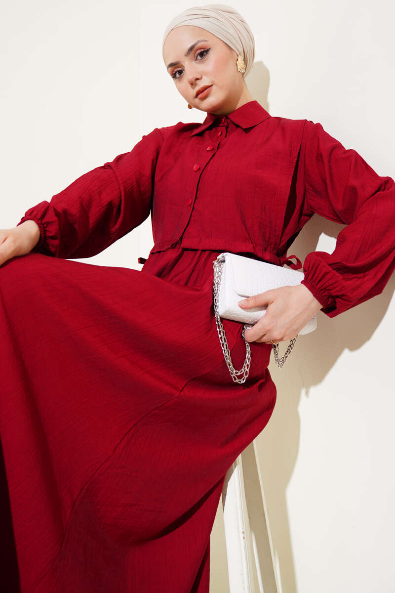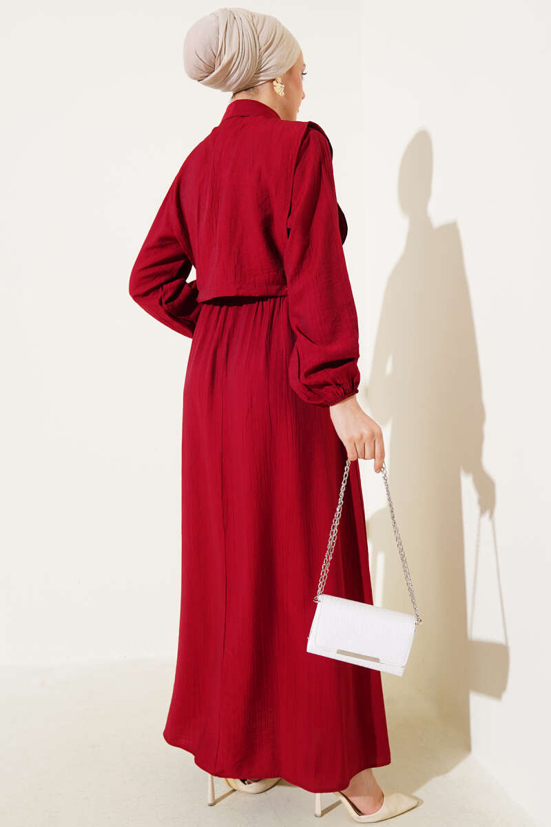 Yarım Taş Düğmeli Volanlı Elbise Bordo