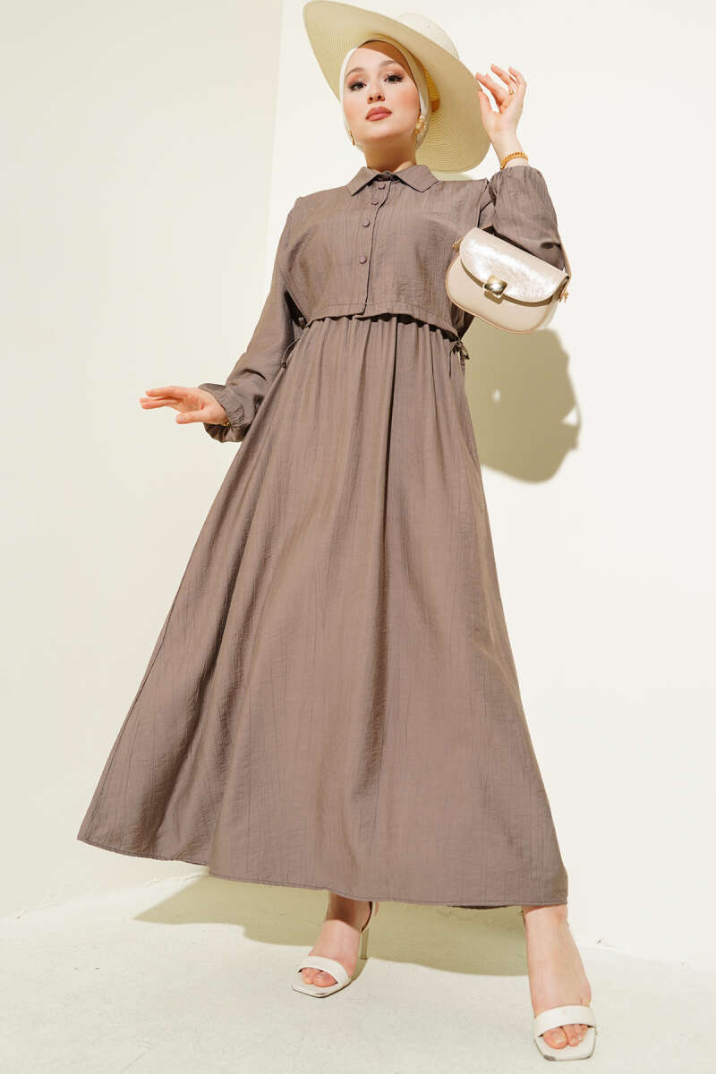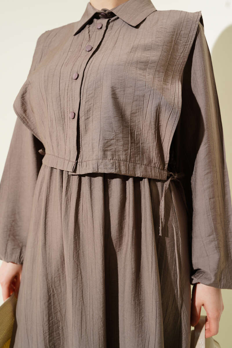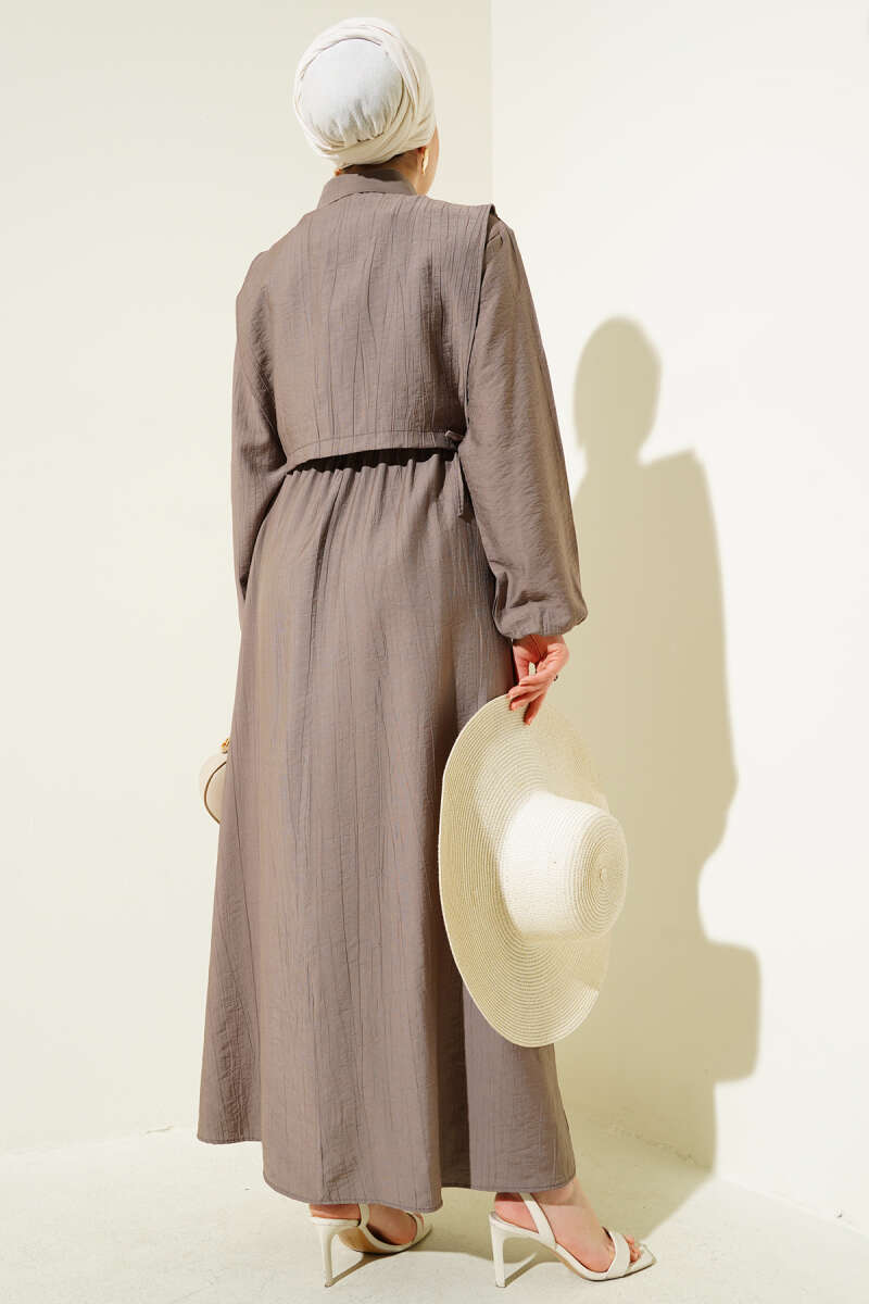Boydan Tahta Düğmeli Kuşaklı Tensel Elbise Vizon