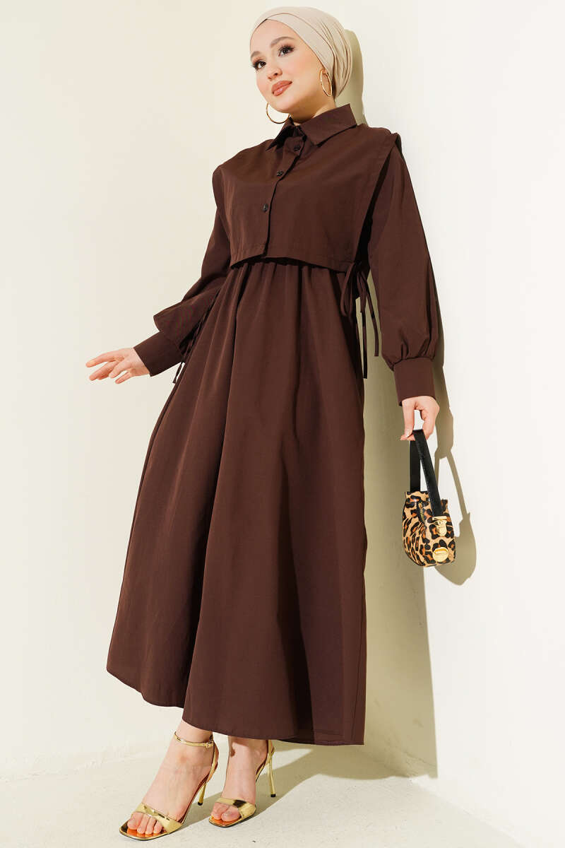 Düğmeli Kemerli Jile Elbise Kahve