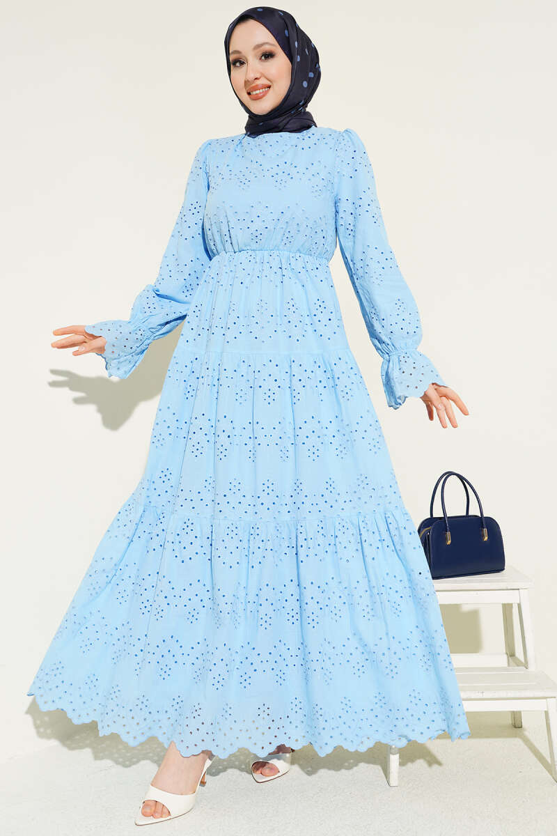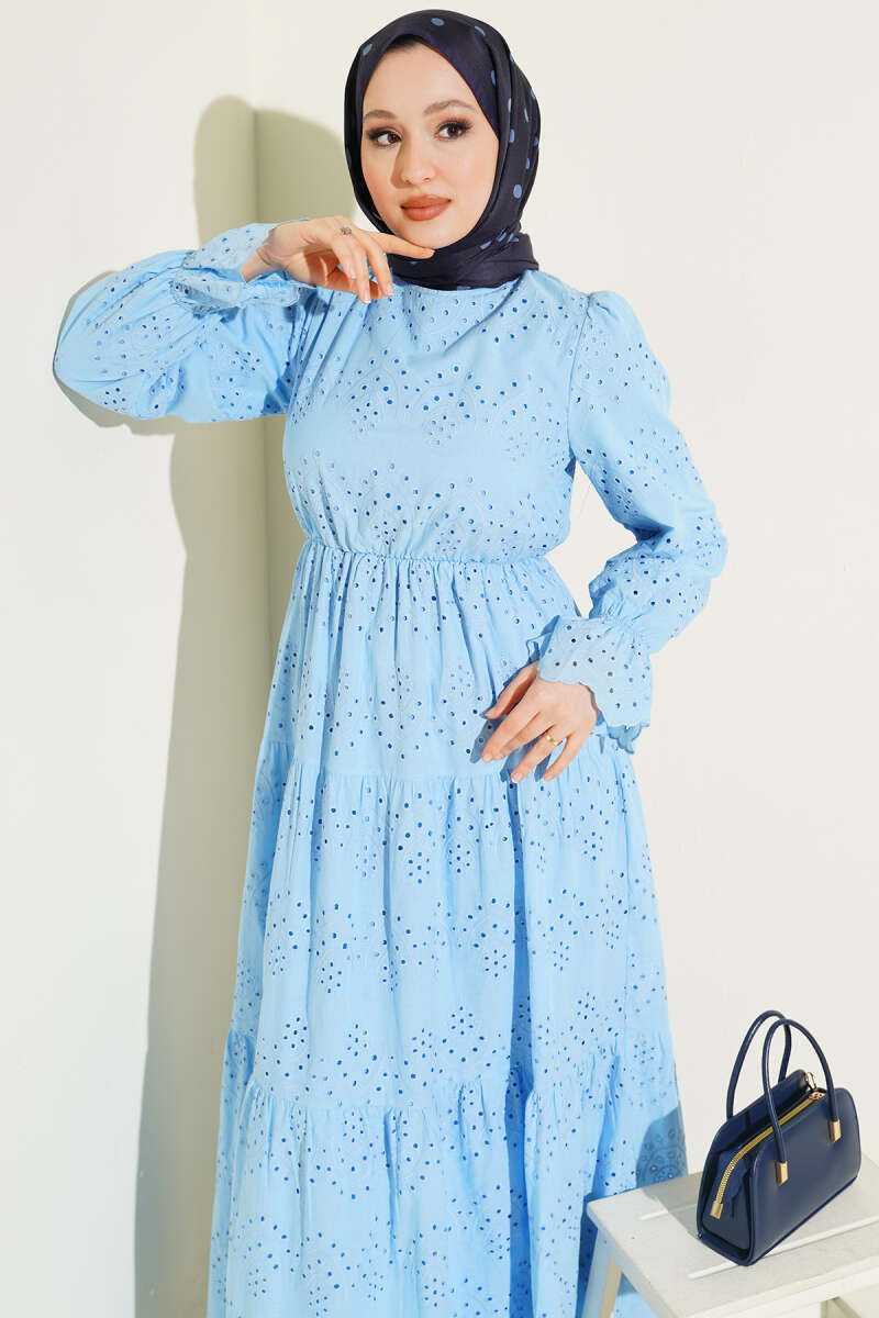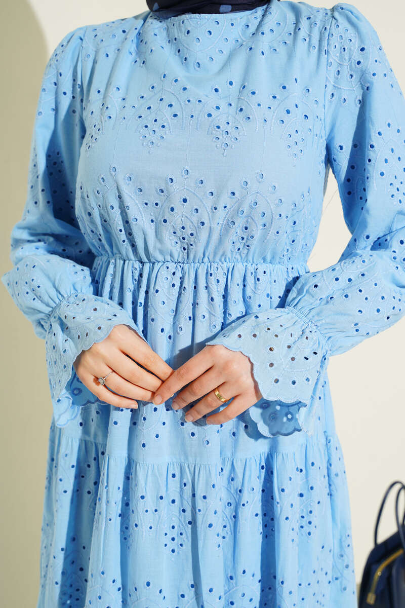Düğmeli Brode Bilek Lastikli Elbise Mavi