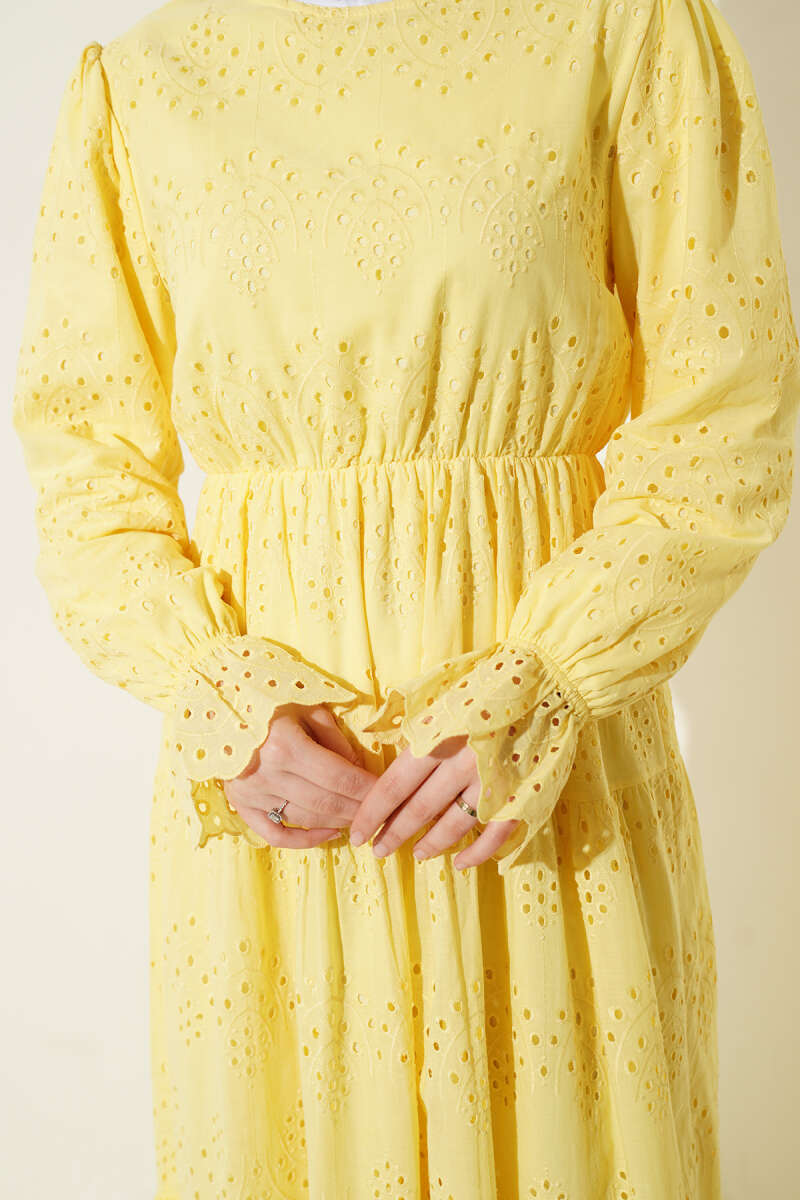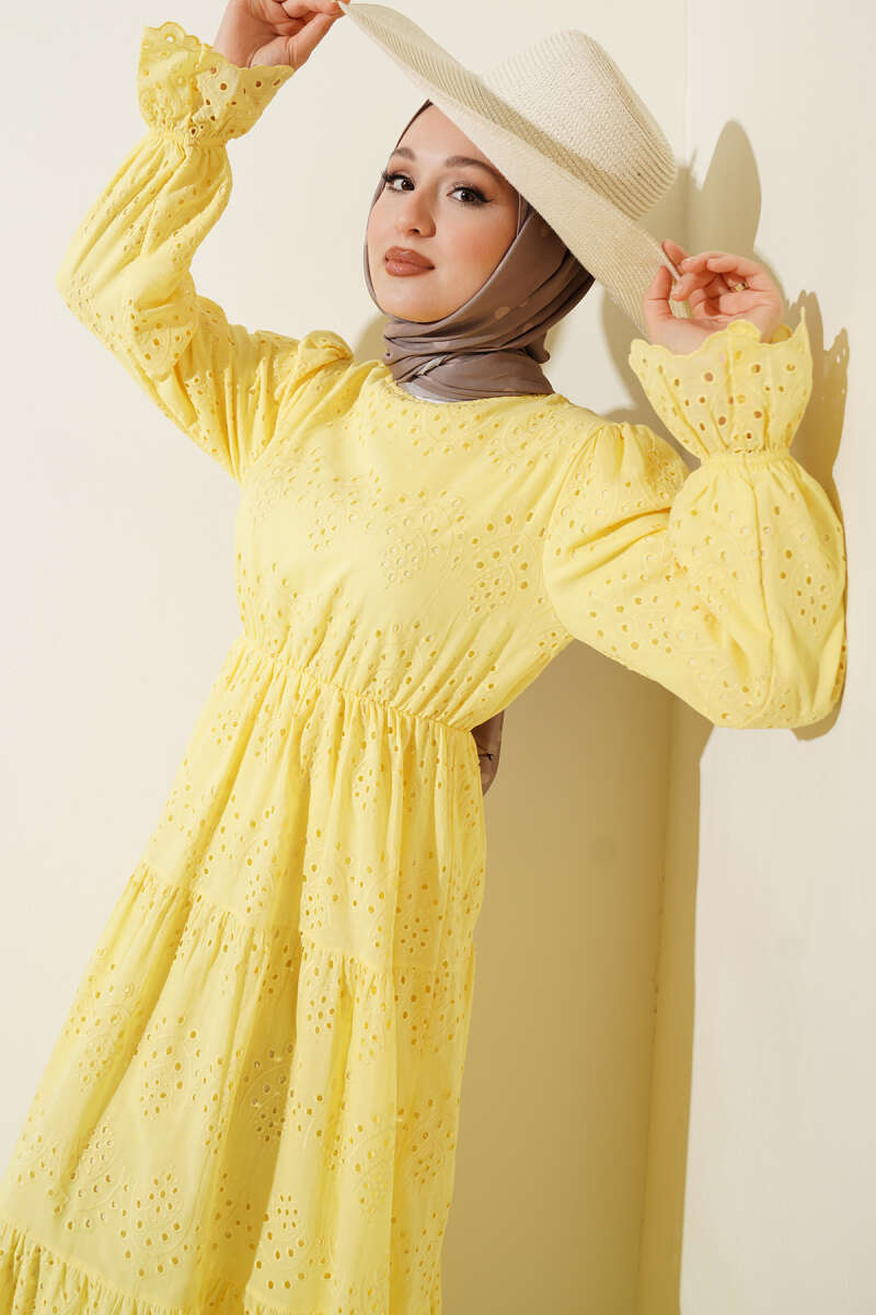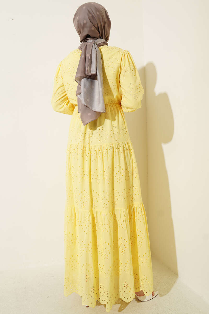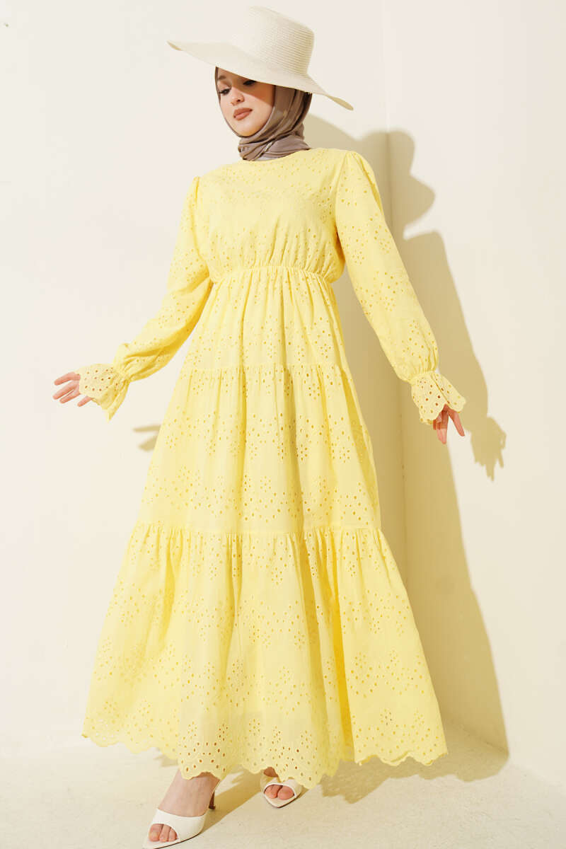 Zarif detayları ve konforlu kesimiyle öne çıkan bu brodeli elbise, gün boyu hem şık hem de rahat hissetmeniz için tasarlandı. Bel kısmındaki esnek lastik detayı vücut hatlarını naifçe vurgularken, katlı etek formu tasarıma hareketli ve bohem bir hava katıyor. Kollarındaki büzgülü manşetler ve kumaş üzerindeki ince işleme detayları, stiline romantik bir dokunuş eklemek isteyenler için ideal bir tercih sunuyor. Nefes alan dokusuyla her mevsime uyum sağlayan bu parça, gardırobunuzun en kurtarıcı ve şık üyelerinden biri olmaya aday.