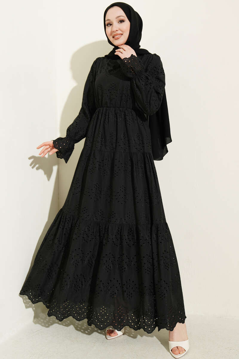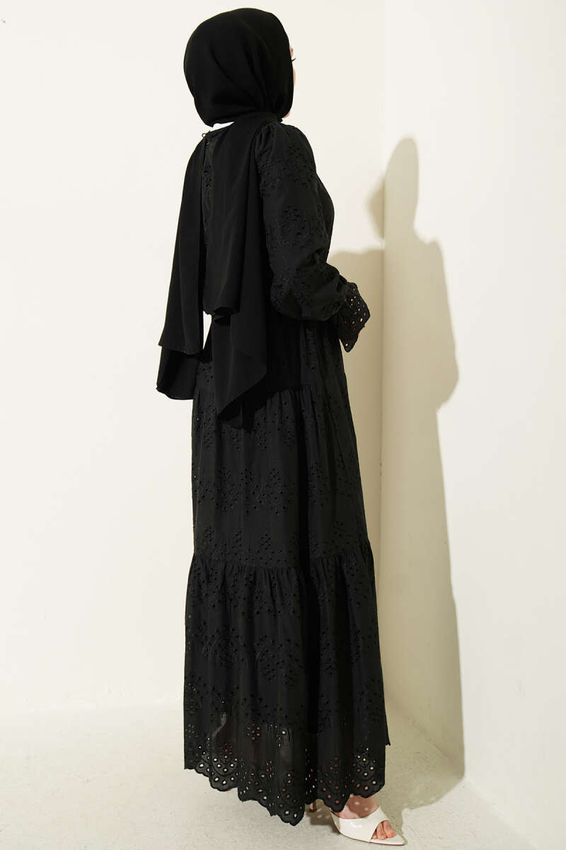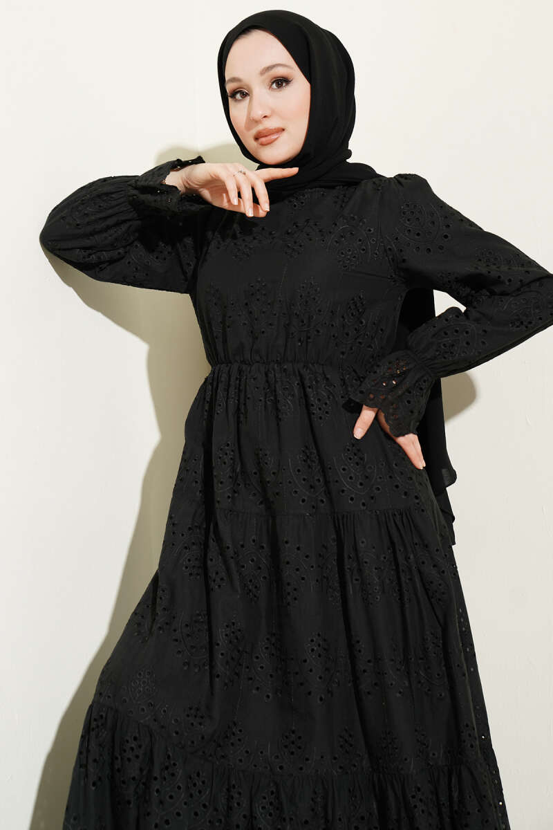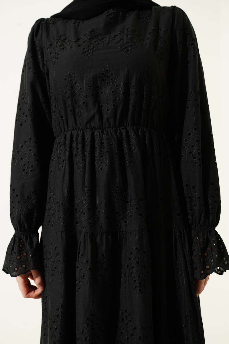 Düğmeli Brode Bilek Lastikli Elbise Siyah
