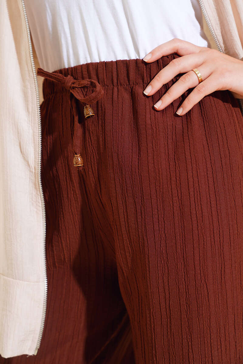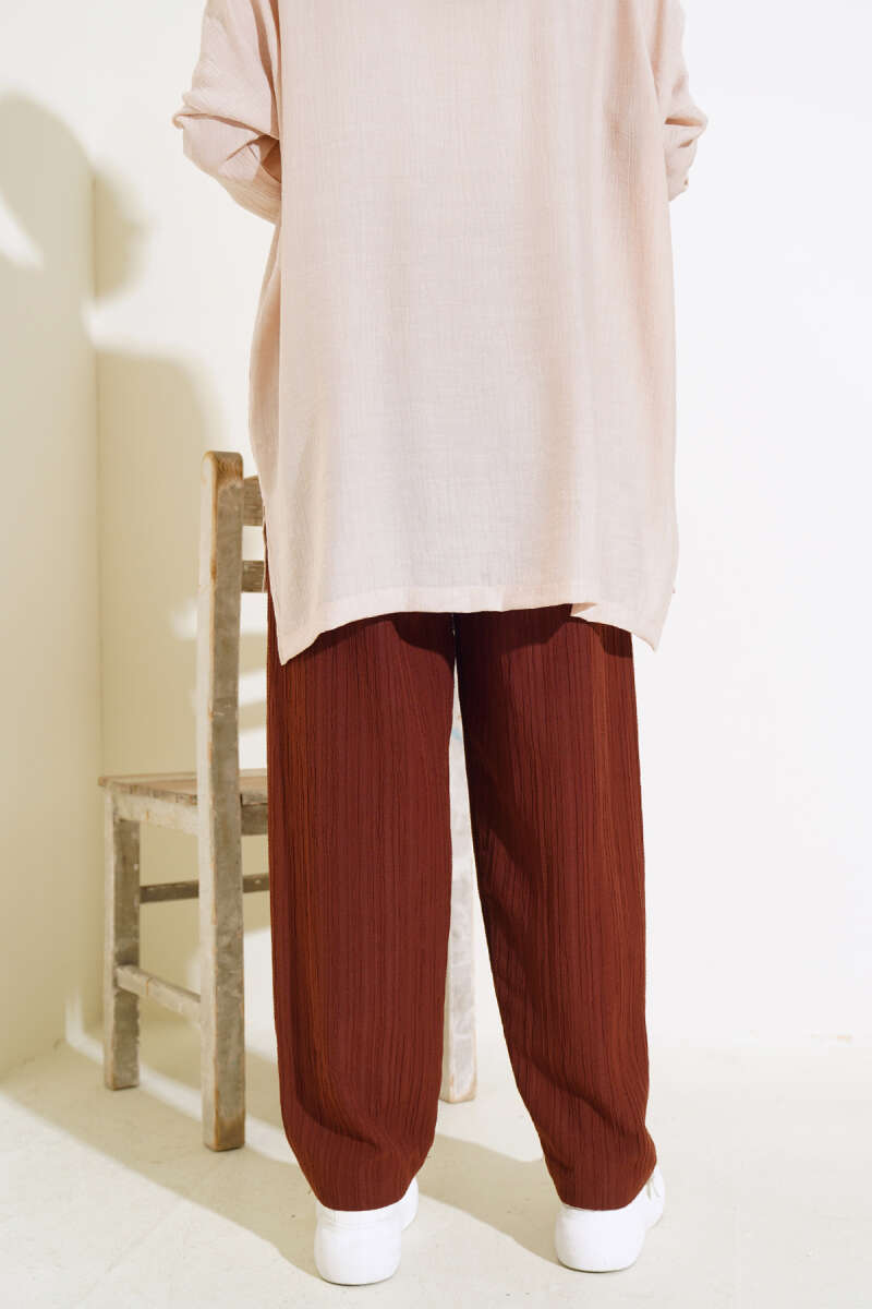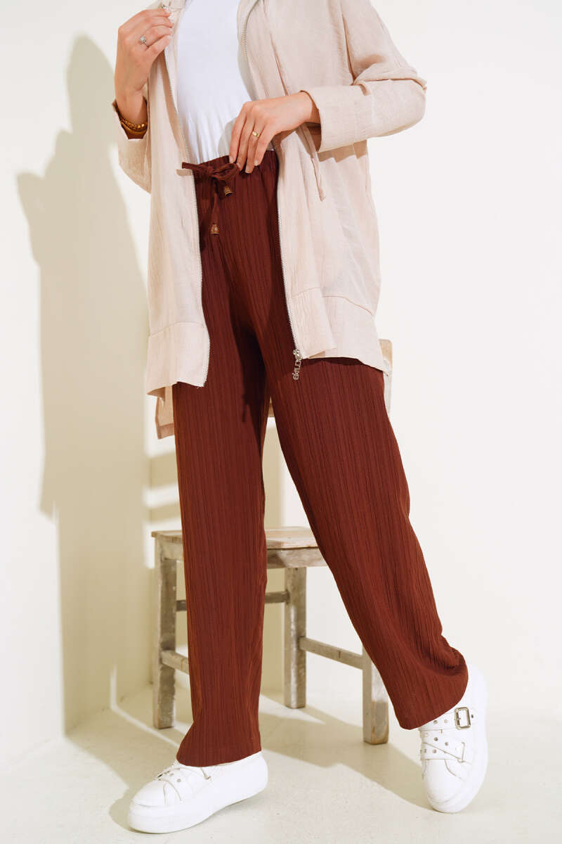 Dar Paça Pileli Kumaş Pantolon Pudra