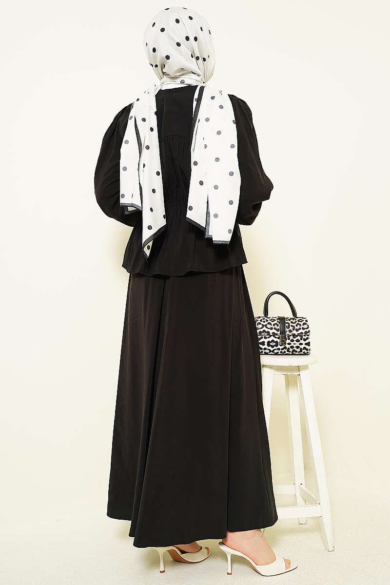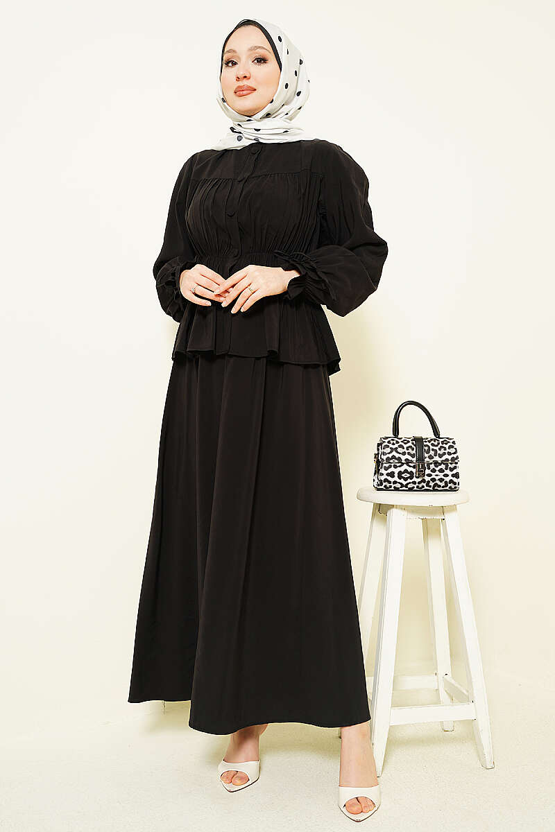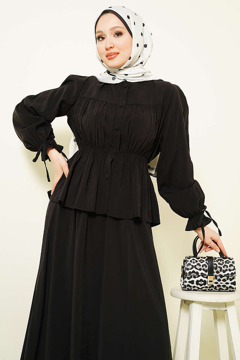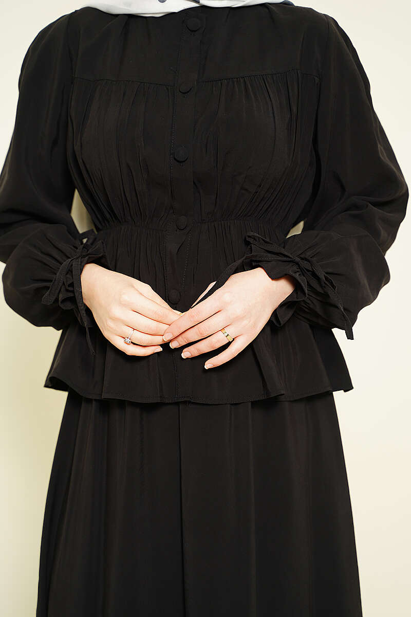 Bel Lastikli Büzgülü Etekli İkili Takım Siyah